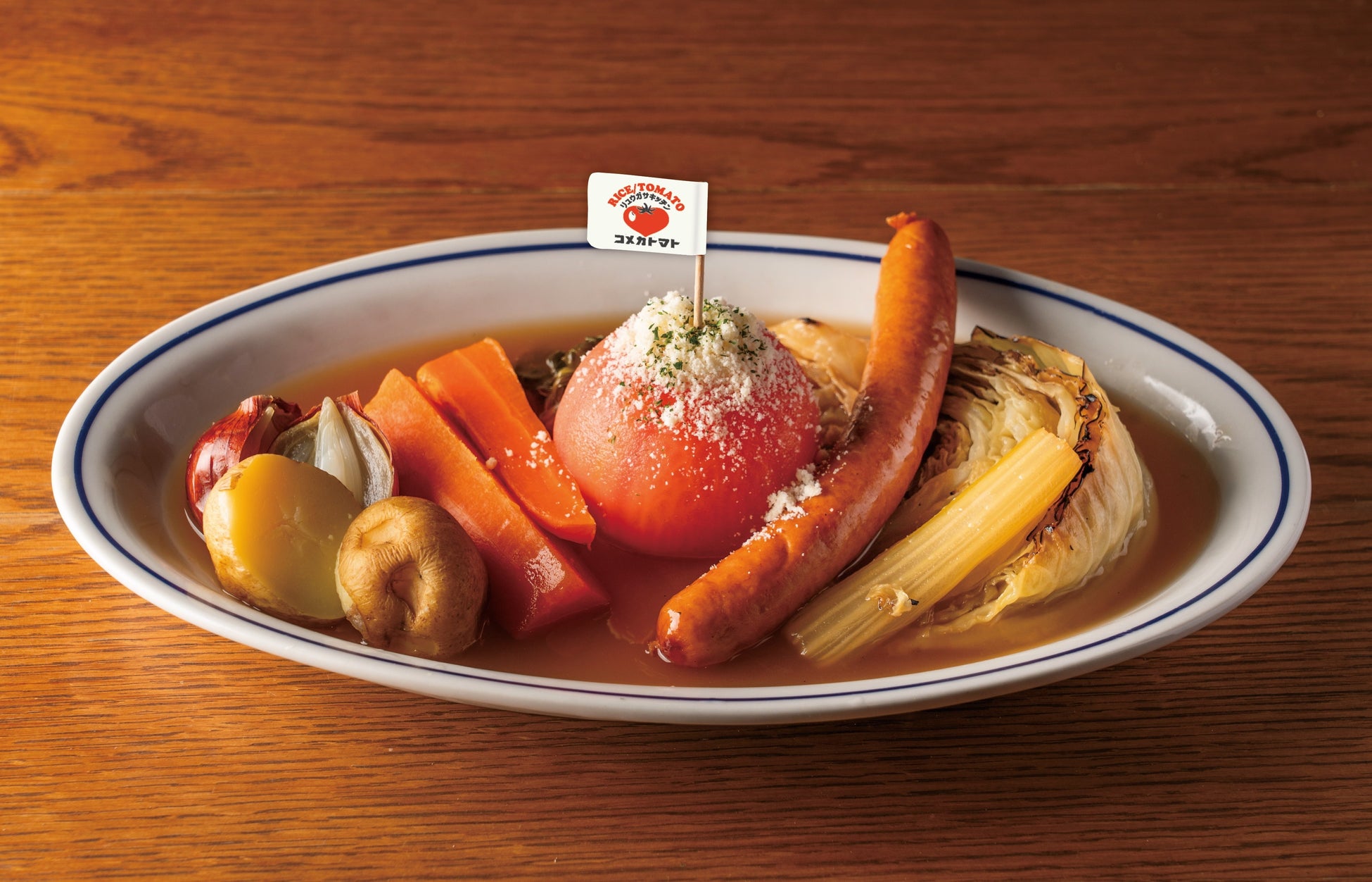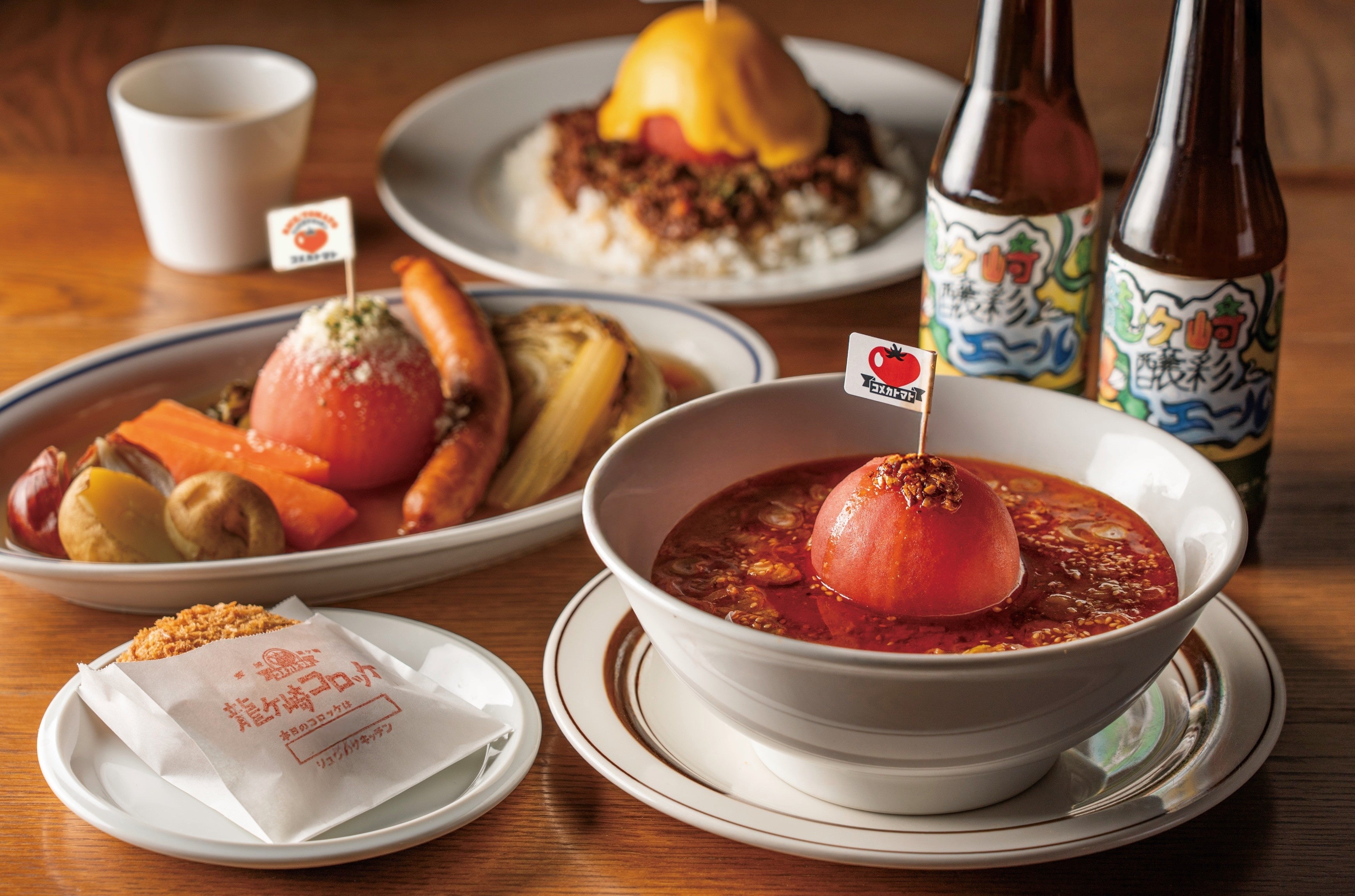 龍ケ崎トマトの魅力を堪能できる「まるごとトマト」シリーズ。前回好評だった担々麺、カレーに加え、新たに「まるごとトマトのポトフ」が登場。主役のトマトはもちろん、野菜それぞれの甘みと旨味を味わえる、素朴ながらも贅沢な逸品です。店頭では「食べる」だけでなく、米もトマトも販売します。マルシェに立ち寄った気分でお楽しみください。