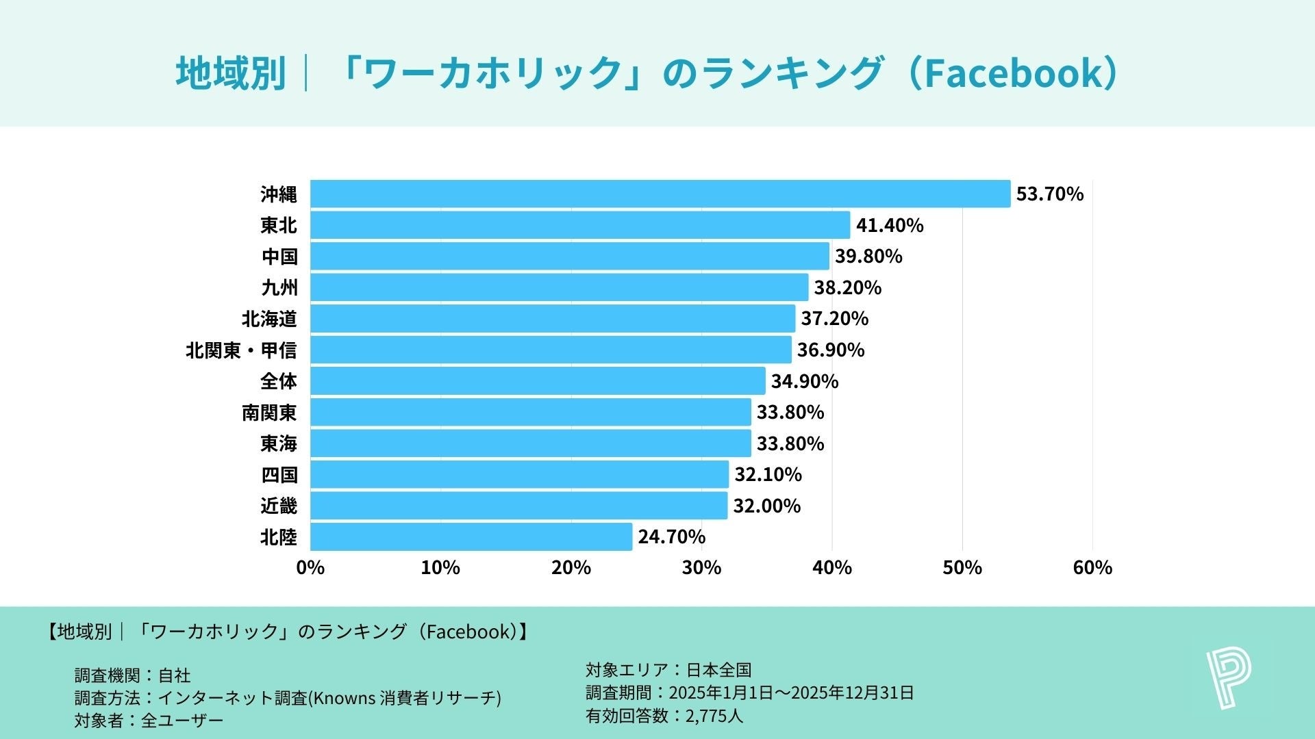 全SNS×地方の最大値はFacebook×沖縄(53.7%)。Facebook全体34.9%に対し、沖縄は53.7%となり、提示データ内で最も高い数値となった。