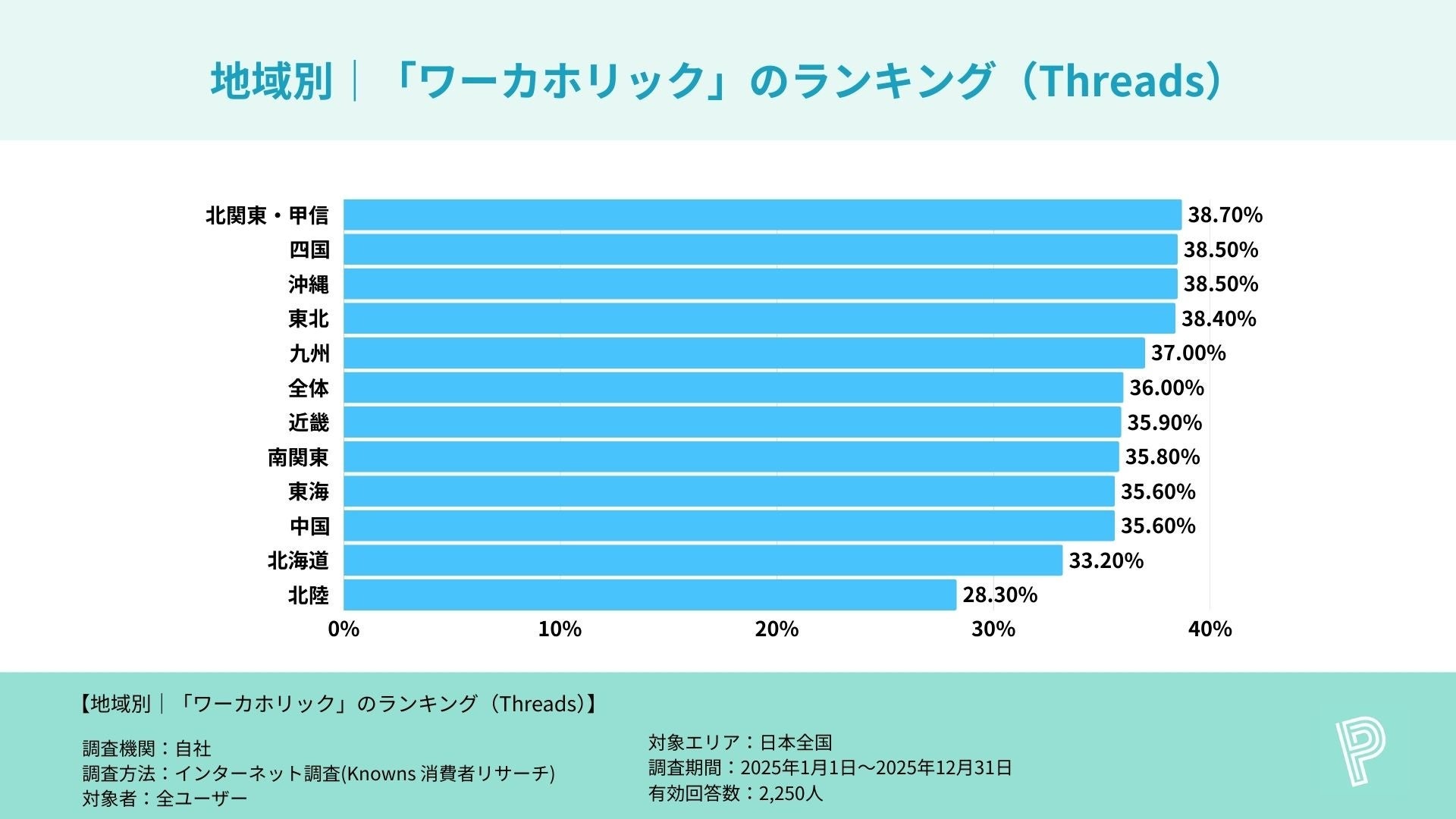 Threads利用者のワーカホリック割合は全体で36%と比較的高く、東北(38.4%)、北関東・甲信(38.7%)、四国(38.5%)、沖縄(38.5%)など地方エリアでも3割後半が目立ち、全国的に高水準で安定しているのが特徴です。一方、X利用者は全体32.8%で、東北(40%)が突出する一方、北陸(24.7%)、北関東・甲信(27.2%)など低い地域もあり、エリアごとの差が大きい結果となりました。それぞれのSNS内で見ると、Threadsは「広く高め」、Xは「地域による強弱がはっきり」という傾向が読み取れます。