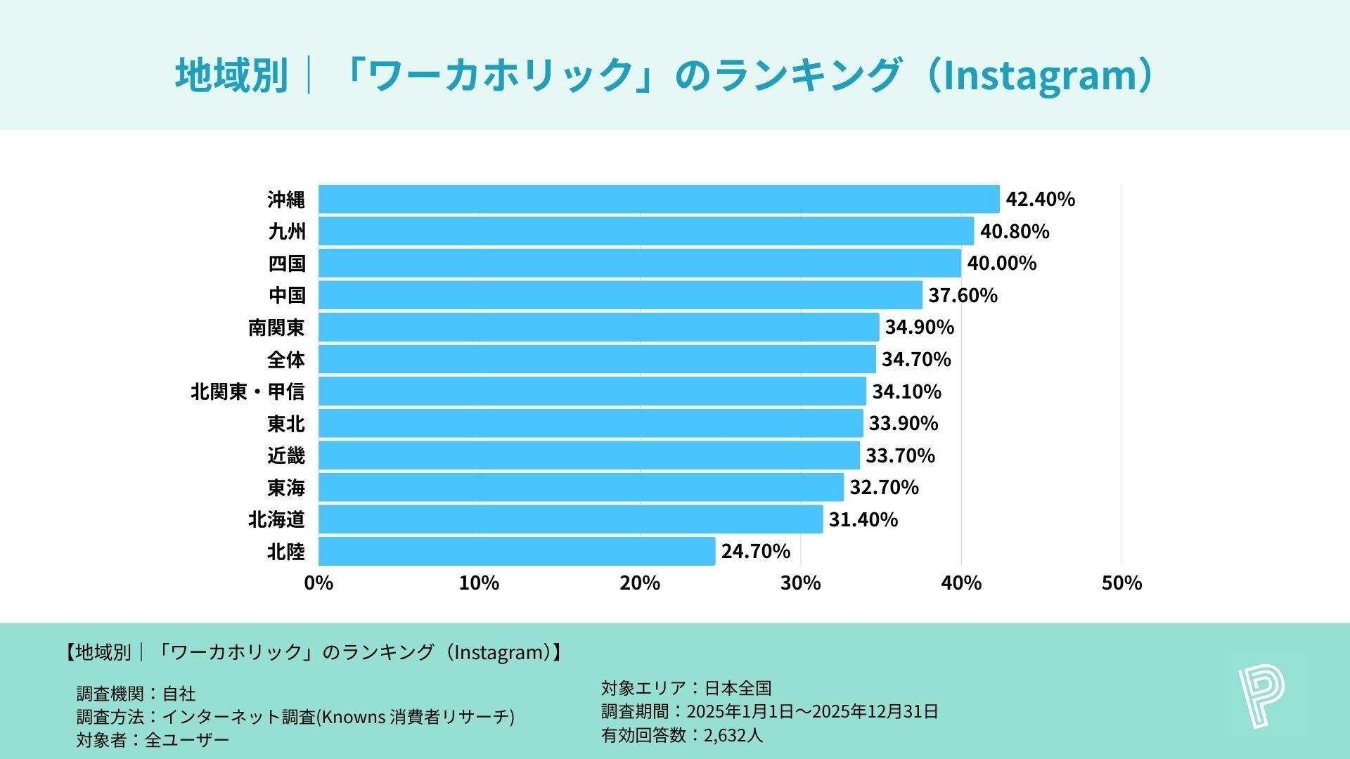 地方別のワーカホリック率を確認すると、沖縄県は複数の主要SNSで40%超かつ地方別上位となりました。具体的に、Instagramは沖縄42.4%で地方別1位(全体34.7%比 +7.7pt)、LINEは沖縄42.8%で地方別1位(全体34.4%比 +8.4pt)、mixiは沖縄42.9%で地方別1位(全体34.7%比 +8.2pt)でした。いずれも全体平均を大きく上回り、沖縄の高さが数値として確認できます。