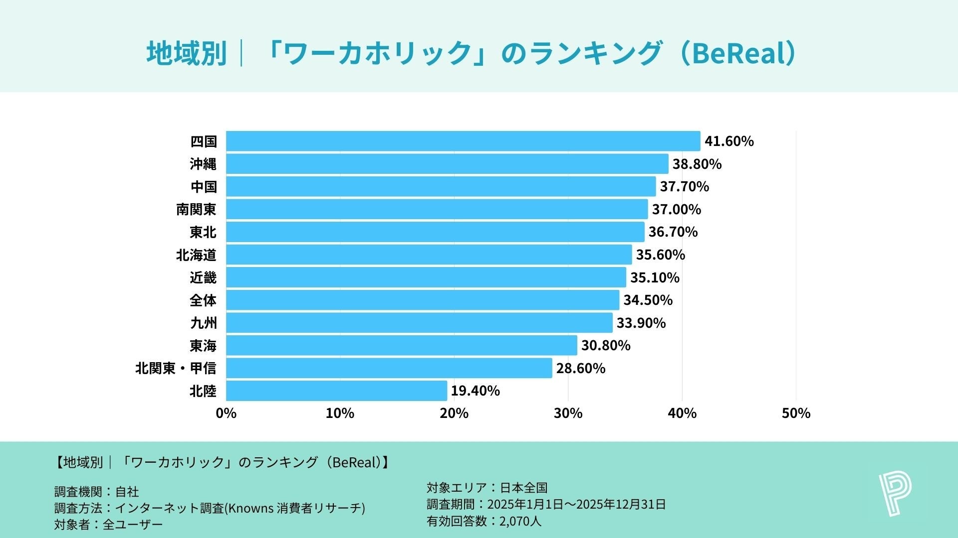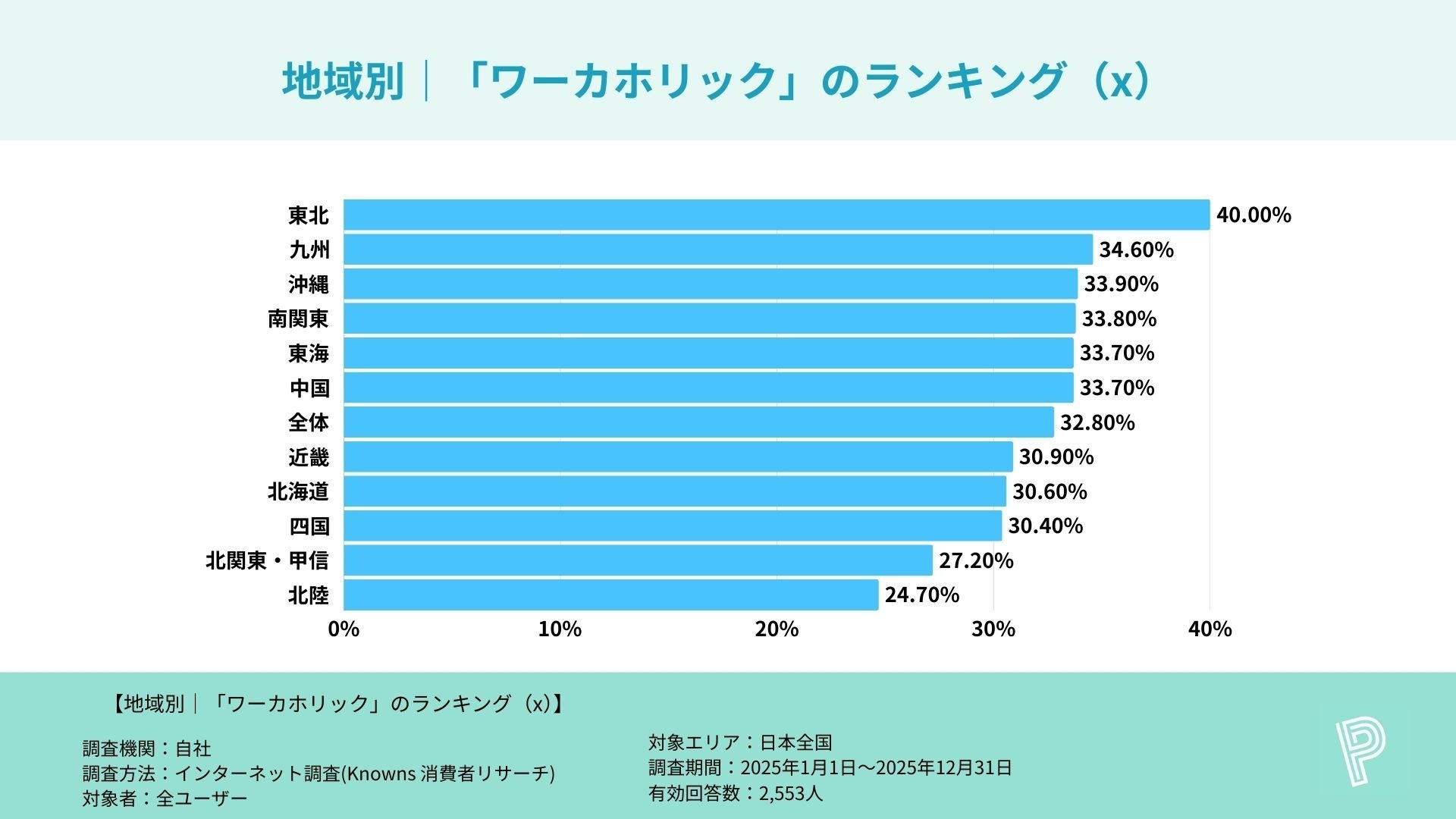 画像投稿や「いいね」をするだけでポイントが貯まる写真共有リワードSNS『ポイシャ(POISHA)』( https://poisha.jp/media/ )を運営する株式会社アドバンは、主要SNSアプリ(Instagram/LINE/X/TikTok/Facebook/Threads/BeReal/TapNow/mixi)利用者におけるワーカホリック割合の地方別比較調査を実施しました。