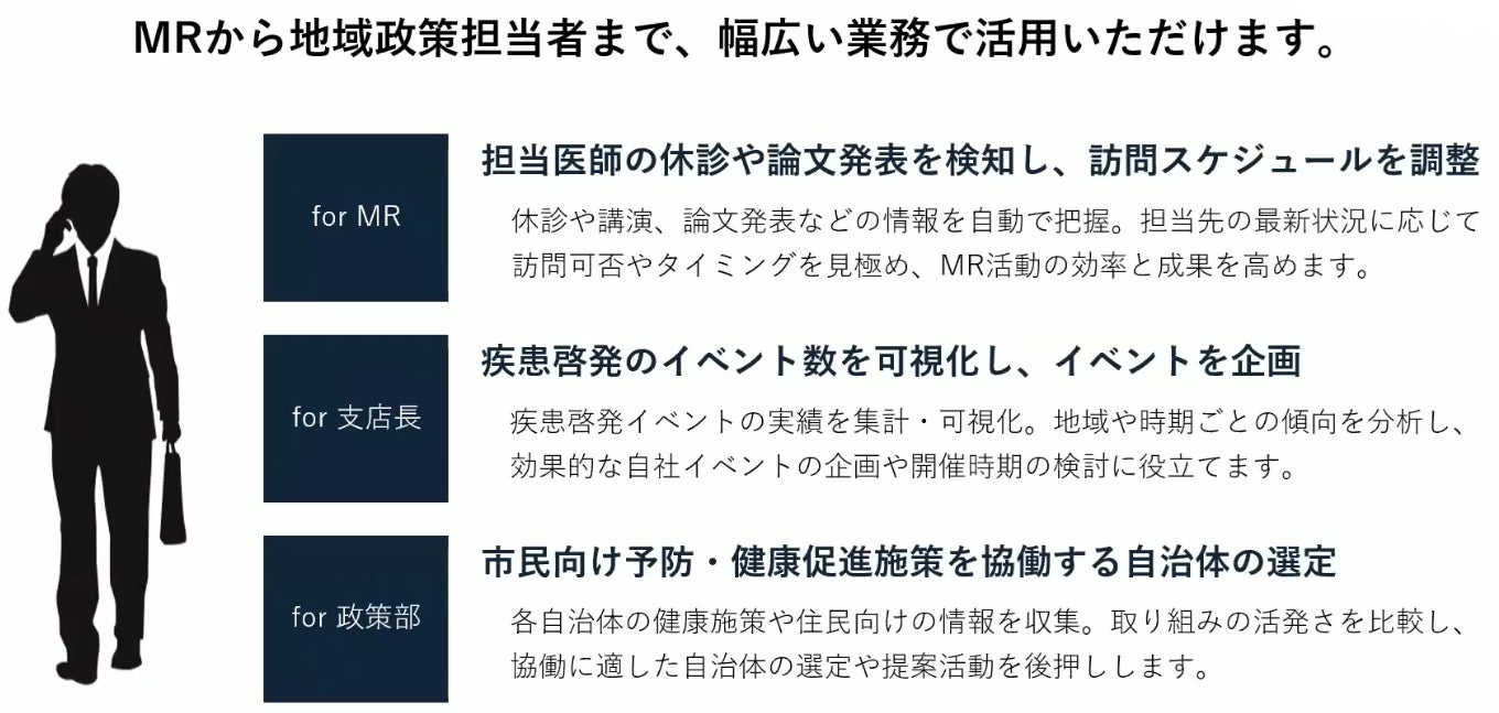 本サービスは、医薬情報担当者(MR)が地域医療の変化を迅速に把握し、より価値の高い訪問活動を実現することを目的としています。