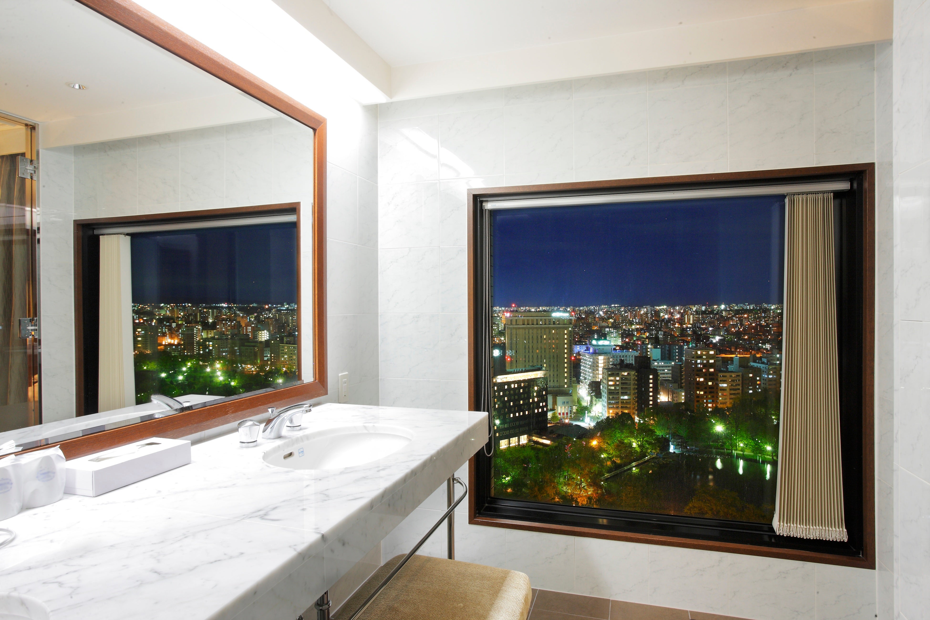 プレミアルームの窓からは、札幌の街並みと隣接する中島公園の四季折々の絶景を一望できます。この機会に贅沢なバスタイムで旅の疲れを癒し、春の中島公園での滞在をお楽しみください。