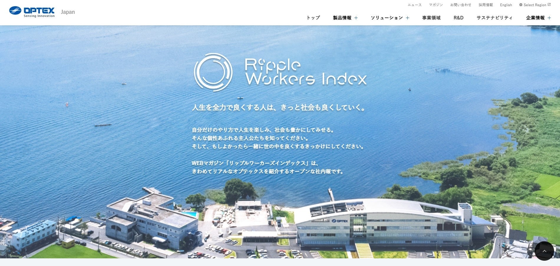 オプテックスは社内外に広がりのあるコミュニケーション生み出すことで、ビジネスを推進する働き方「Ripple Work」を実践しています。『Ripple Workers Index』は、そのような環境下で自己実現することを目指し、家族や会社、さらには社会にも貢献していく人々を深堀するWEBマガジンです。コンセプトは「人生を良くする人は、きっと社会も良くしていく」。個性豊かなオプテックスパーソンをぜひご覧ください。