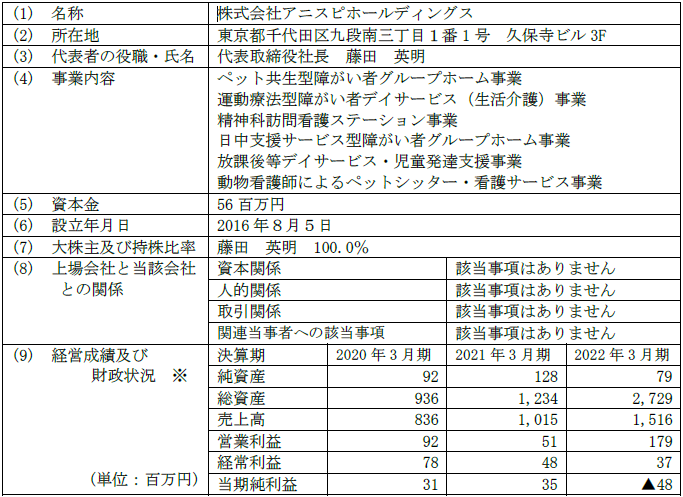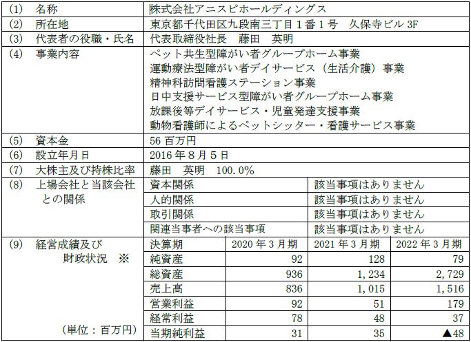 リネットジャパングループ株式会社は、2023年3月1日開催の取締役会において、障がい者向けグループホームを全国に直営・FC含め累積開設約1,200拠点を展開する株式会社アニスピホールディングス(以下、「アニスピ社」という。)の発行済全株式の取得による完全子会社化に向けて契約を締結することを決議いたしましたのでお知らせいたします。
