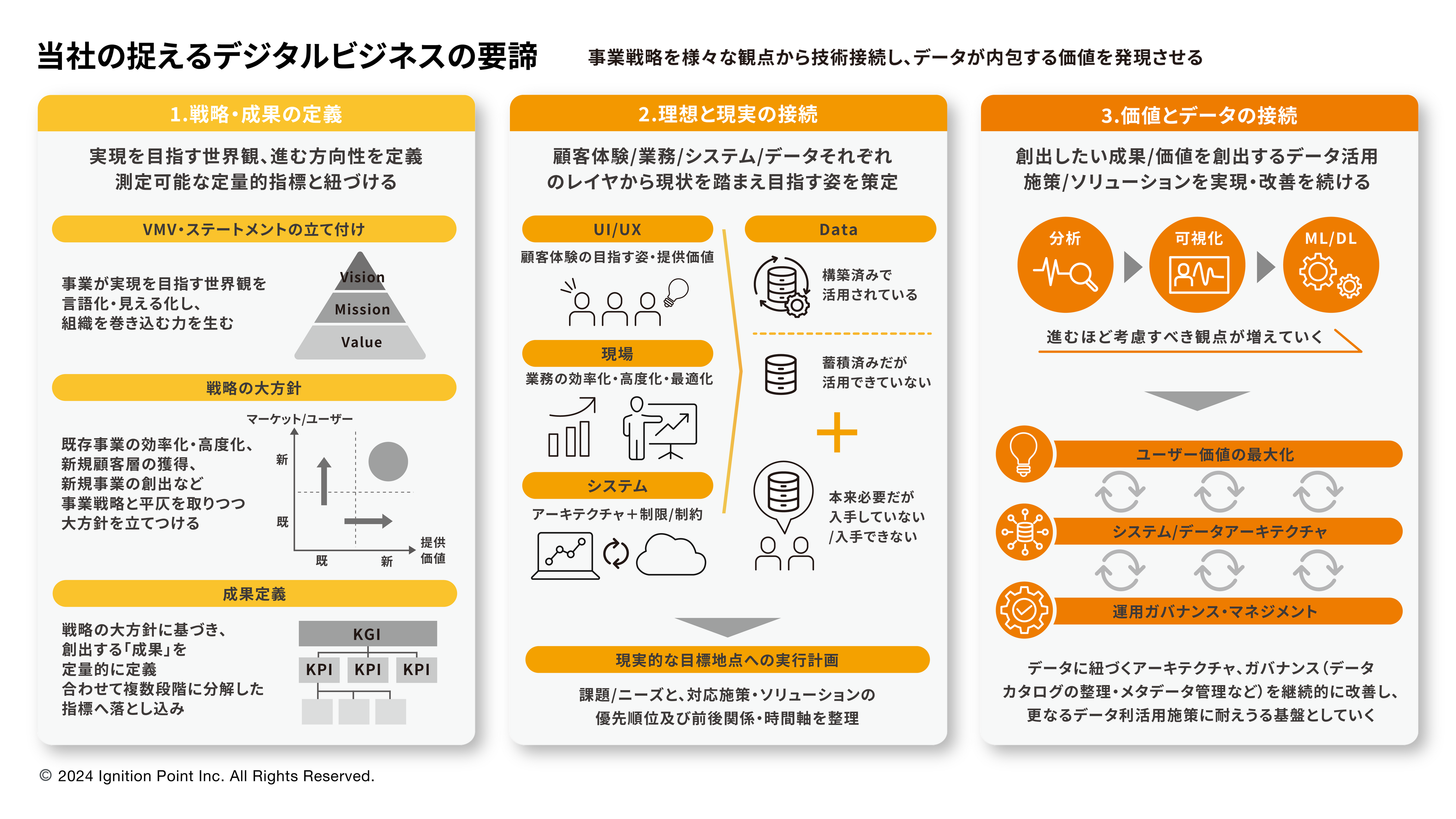 データ利活用を力強く推進するためには、各領域のスペシャリストと、広く事業を見渡して戦略を戦術に落とし込むジェネラリストの協力が不可欠です。イグニション・ポイントは、自社内で保有する事業ドメイン知識や事業創出・開発の知見、データサイエンティスト・データアーキテクトの技術スペシャリティを組み合せたシームレスな協業体制を構築し、専門知識に裏打ちされた活動によって事業価値向上に貢献します。