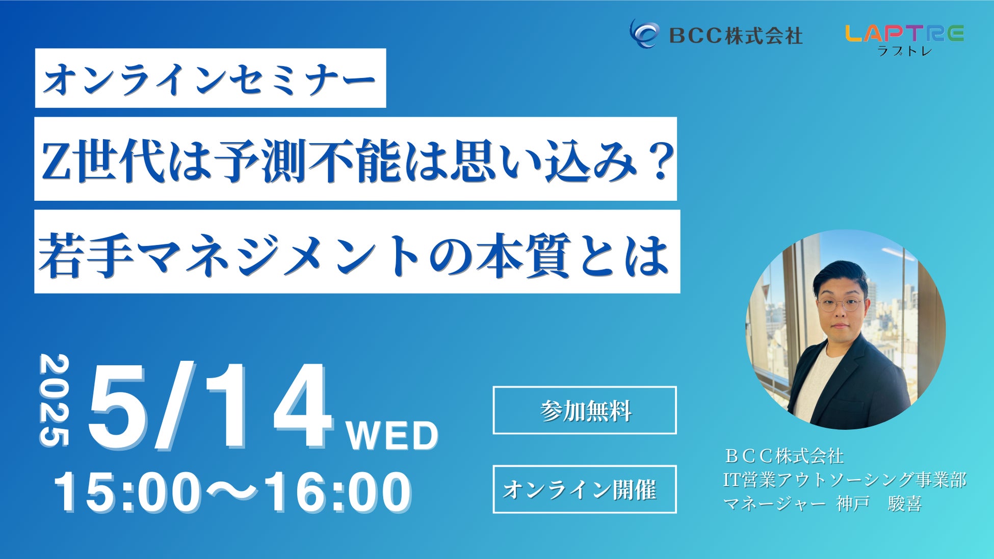 BCC株式会社(本社:大阪市中央区、代表取締役社長:伊藤 一彦、東証グロース上場:証券コード7376、以下当社)は、昨今のマネジメントにおける若手人材育成の課題にフォーカスを当てたオンラインセミナー「Z世代は予測不能は思い込み?若手マネジメントの本質とは」を5月14日(水)15:00~開催します。