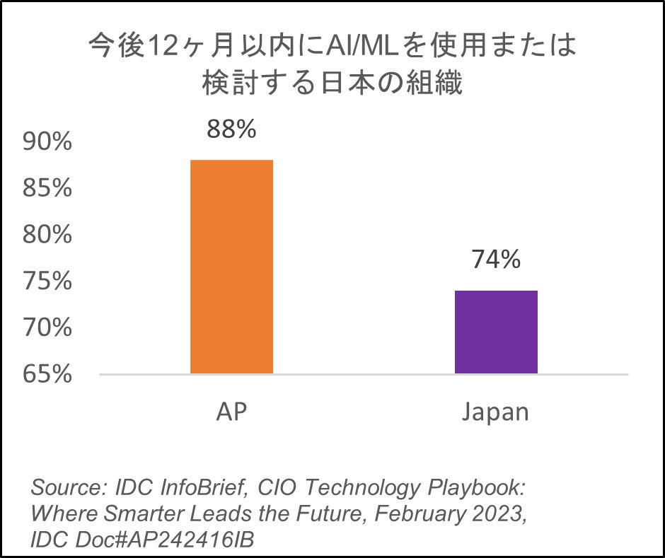 様々な業種において、多種多様なビジネスユースケースや機能のために組織がAIによるアプリケーションを利用すると見込まれています。ところが、日本はデジタル化の成熟した市場であるにもかかわらず、AIアプリケーションを使用あるいは検討すると答えた組織の割合はAPの平均よりも低い(74%)結果でした。