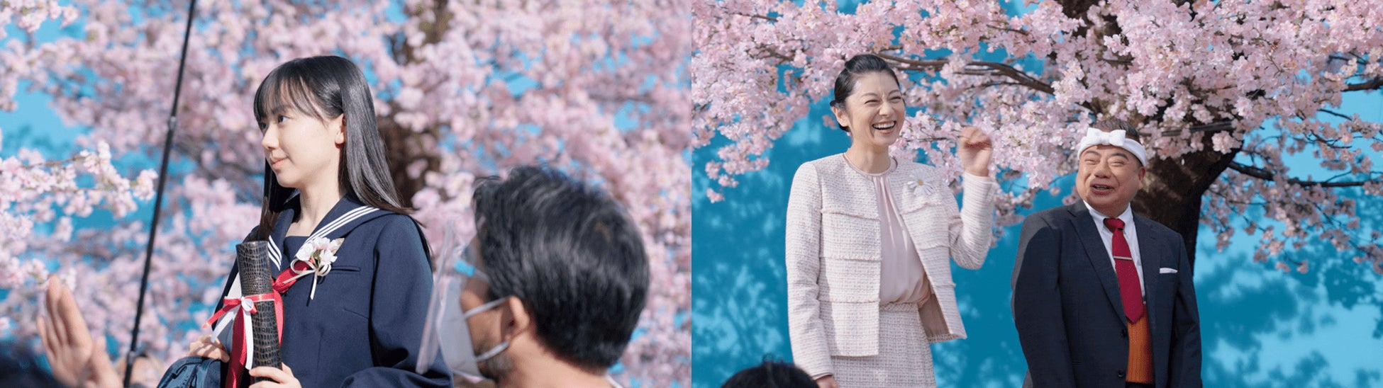 セーラー服を着て「お願いします!」と、爽やかに撮影現場に入った芦田さん。リアルに再現された桜並木のセットや、桜吹雪を舞い散らせる演出を楽しそうに見回していました。桜舞い散る中、両親への感謝を伝えるシーンでは、大人っぽく凛とした表情で、思わず引き込まれる演技を見せた一方、出川さんの大号泣を見て驚きながらも笑うシーンでは監督から要求された「ビッグスマイル」での演技を一発OKで披露するなど、多彩な表情での演技で撮影現場を引っ張っていただきました。