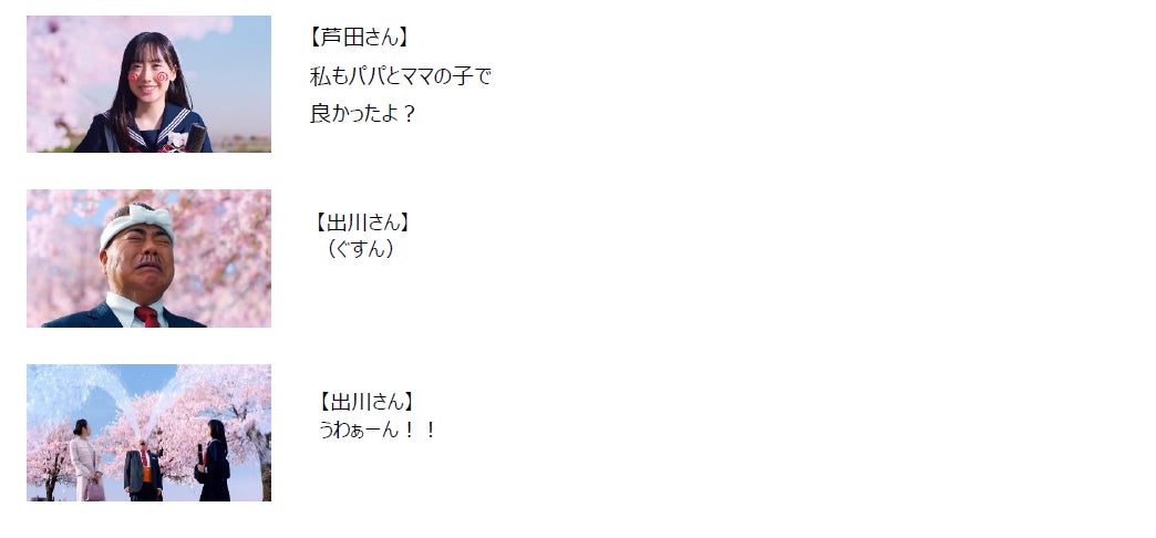 また小池さんの、母親として子供の卒業を心からお祝いしていることが伝わってくる演技や、芦田さんの凛とした表情で短い言葉の中にもたくさんの両親への感謝の気持ちを込めた演技など、国民的俳優であるお二人の多彩な「表情で魅せる演技」も必見です。