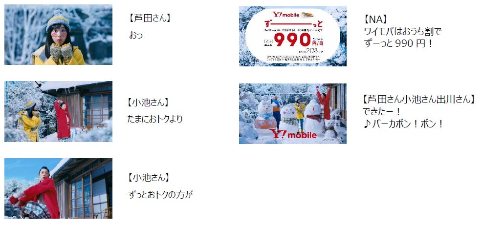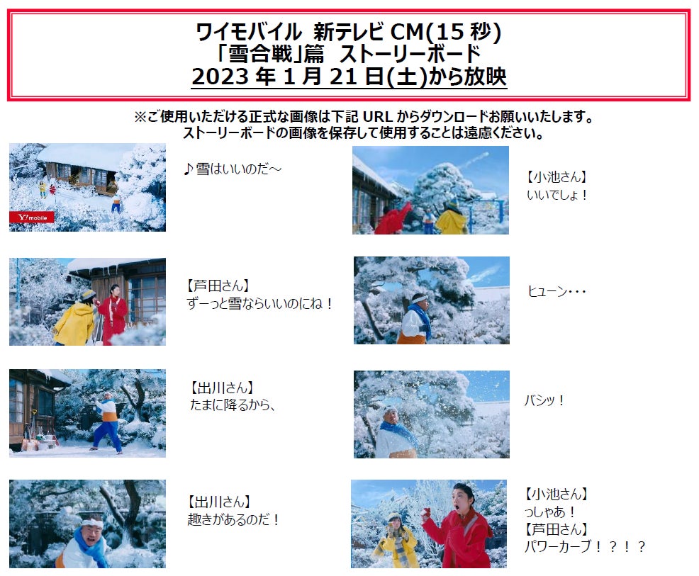 なお、同日より基本使用料が家族全員月々990円から使える“ワイモバイル“の料金プラン「シンプルS」の魅力を伝える「雪合戦」篇も放映を開始いたします。仲むつまじいバカボン一家の雪の日の1シーンをお楽しみいただけます。