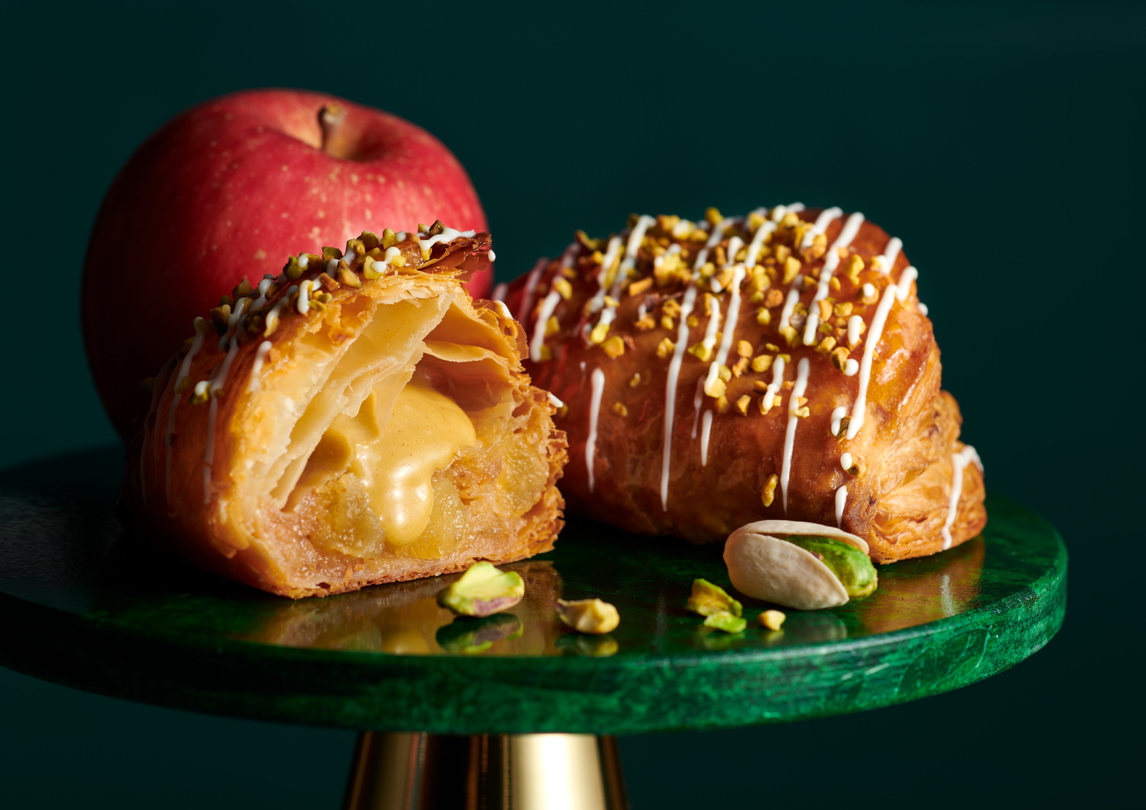 香ばしいピスタチオローストペーストを合わせたカスタードクリームと甘酸っぱいりんごプレザーブの組み合わせでリッチな味わいが口いっぱいに広がります。ホワイトチョコレートコーチングとピスタチオのトッピングで仕上げ、華やかな見た目に仕上げました。