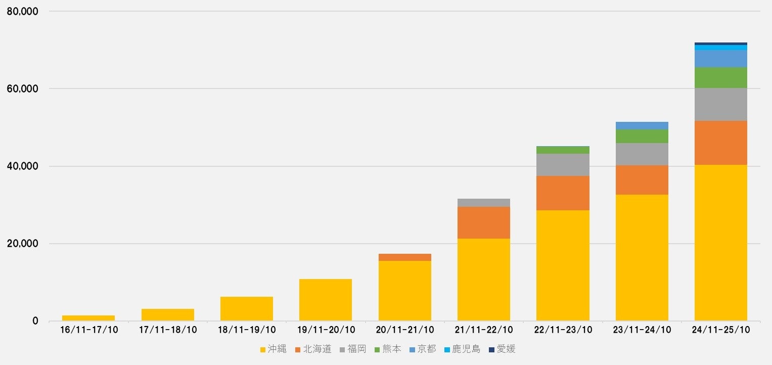 また、サービスインからの累計マッチング件数*1は238,704件となりました。年間マッチング件数においても、昨年の件数が五拠点合計で51,430件であったのに対し、今年は七拠点合計で71,856件のマッチング創出に成功しました。現在「ジョブアンテナ」は、沖縄、北海道、福岡、熊本、京都、鹿児島、愛媛の七拠点に進出しており、今後の地域展開としては、富山および山形への進出を計画しています。引き続き地域の人々が働きたい会社と出会える求人・転職メディアとして、求職者が活躍できる場の紹介を着実に広げてまいります。