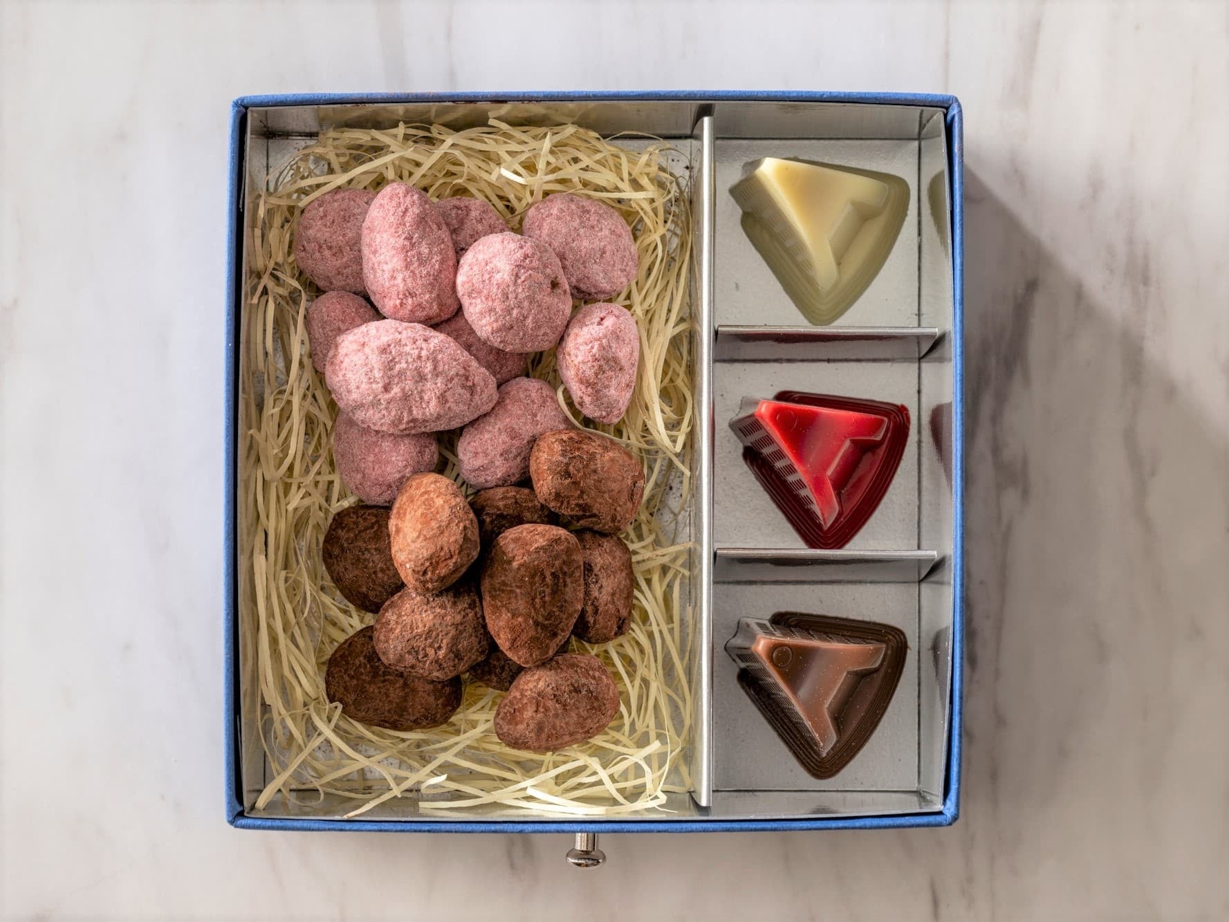 宝石箱のような3段のボックスには、ボンボンショコラ18種と特製のアーモンドショコラ2種、ホテルの外観を模したチョコレート3種が入っています。新作を含む全種類のボンボンショコラが揃ったプレミアムなセットです。