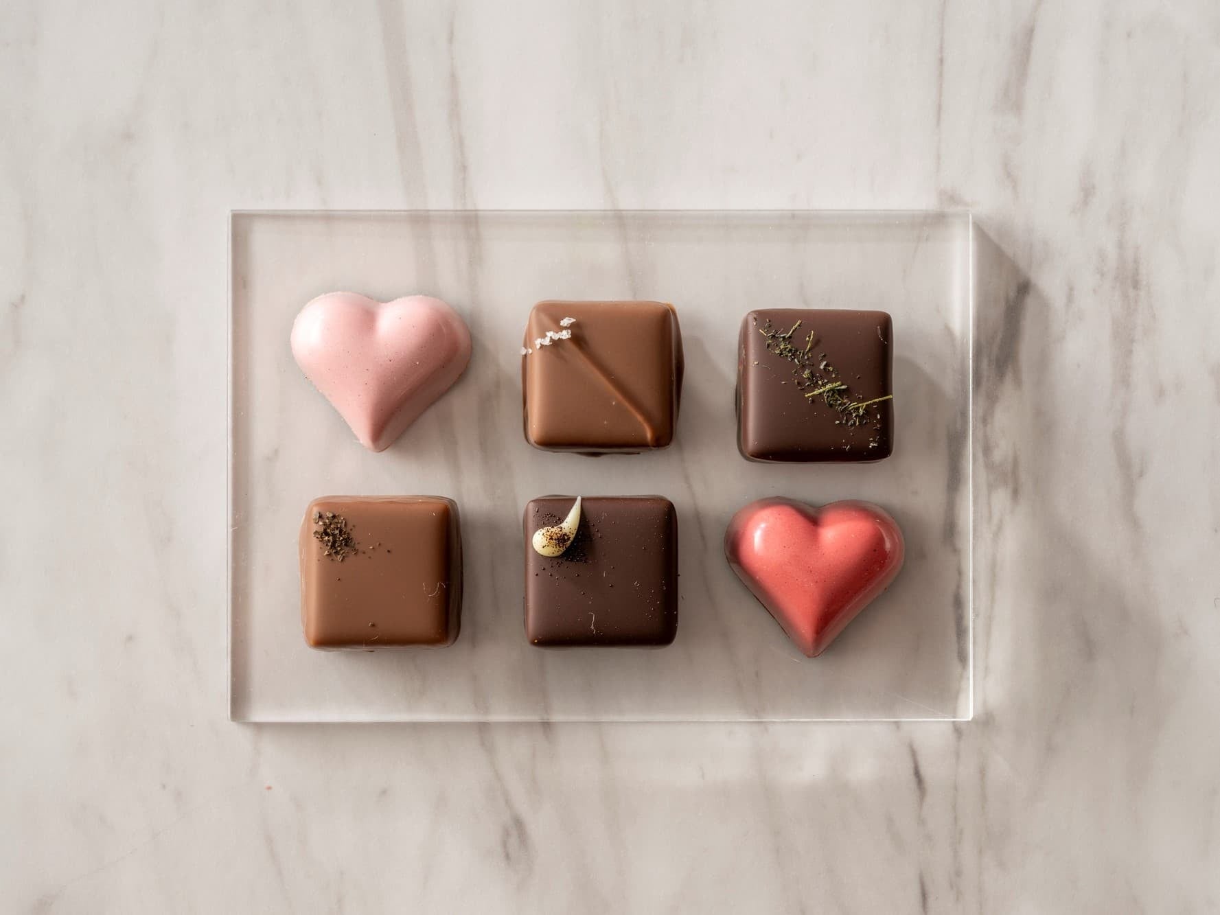 つややかなハート型のボンボンショコラには、それぞれ、いちご、紅茶、キャラメルと3つの異なるフレーバーが入っています。洗練された味わいで宝石のような美しいショコラは、ご友人へのプチギフトなどにもピッタリです。