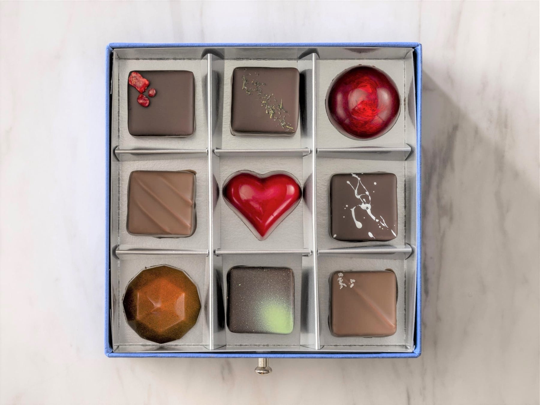 真っ赤なハートが印象的なフレーズショコラを中心に、新作のアプリコットミルクやオレンジリキュールが香るグラン マルニエ キャラメルなど9種のショコラを贅沢に詰め合わせた、華やかでバラエティ豊かなセレクションです。