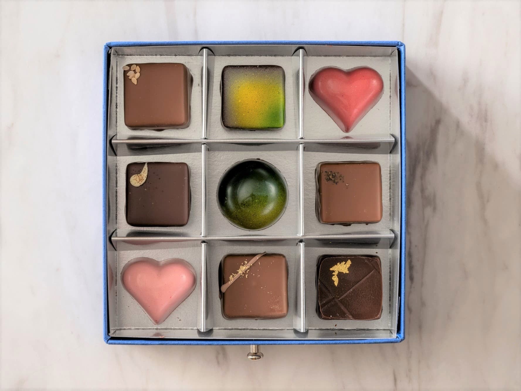 (1段目:セサミ/ゆずと抹茶/フルール・マリン/ティラミス/ライムとオリーブオイル/ほうじ茶/キャラメルバニラ/チャイ/スペシャルビター 2段目:プラリネフレーズ/美肌彩茶/ラズベリーココ★/キャラメルぺカン/フレーズショコラ/SAKE★/グランマルニエ キャラメル★/ピスタチオ/アプリコットミルク 3段目:マルコナアーモンドショコラ(ルビー/ココア)2種/ホテルシェイプチョコレート(ホワイト/フレーズ/ミルク)3個)