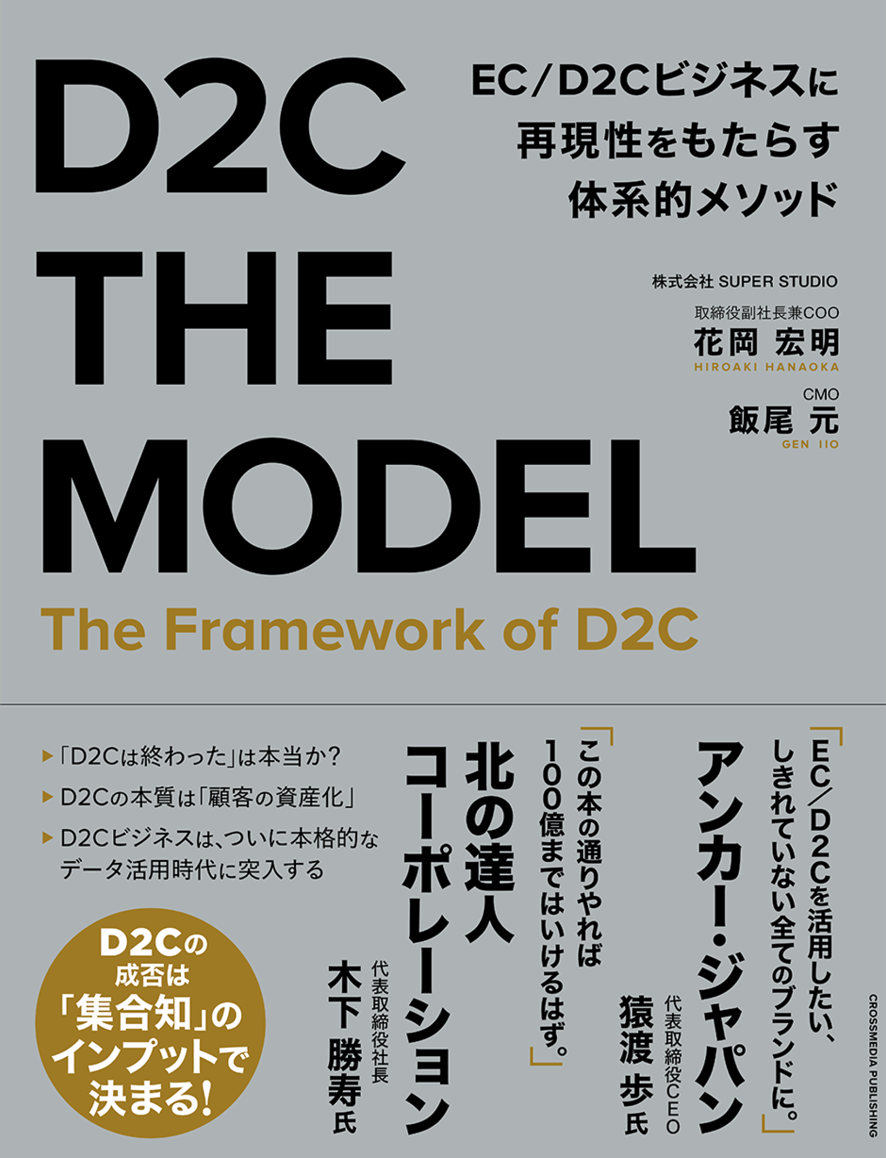 「D2C THE MODEL」は、ECプラットフォーム「ecforce」(イーシー・フォース)を提供するSUPER STUDIO 取締役 COO 花岡、執行役員 CMO 飯尾がD2Cビジネスの成功確率を最大化するための方法論を体系的にまとめた超実践的バイブルです。