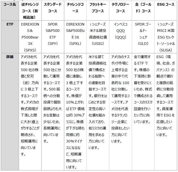 今回、株式相場の下落局面であっても利益の獲得を目指したいというお客様のご要望を多くいただき、新たに「逆チャレンジコース」を追加しました。「逆チャレンジコース」の追加に伴い、「スタンダードコース」「チャレンジコース」「フラットキープコース」「テクノロジーコース」「金(ゴールド)コース」「ESGコース」と合わせて計7コースのご用意となり、よりユーザーの運用スタイルや好みに合わせた銘柄をお選びいただけるようになりました。