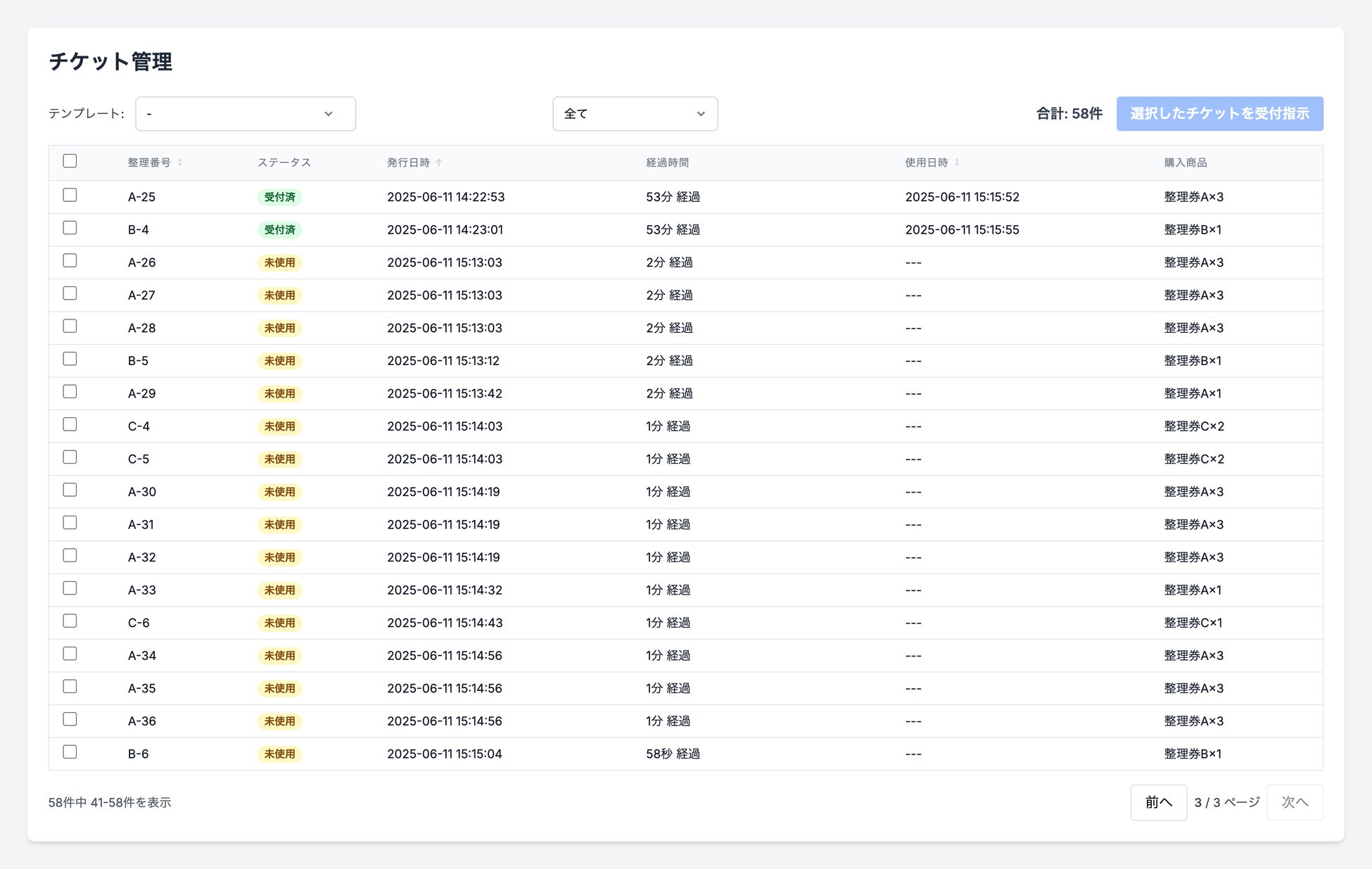 ⑤発行後、管理画面上で順番・経過時間をリアルタイム管理