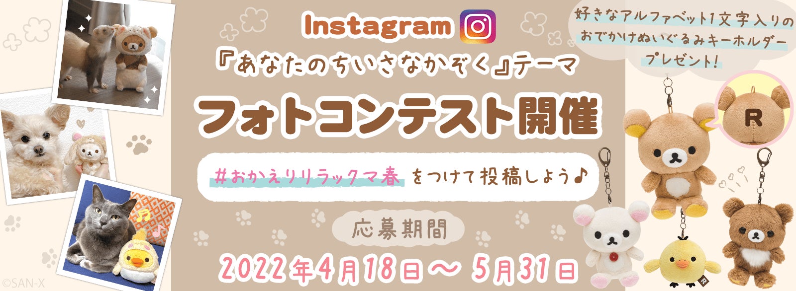 ハッシュタグ「#おかえりリラックマ春」をつけて、「リラックマ」たちとおうちのペットちゃんの写真をInstagramに投稿いただき、その中からペット賞に選ばれた4名様には好きなアルファベット1文字入りのおでかけぬいぐるみキーホルダー1個をプレゼントします。