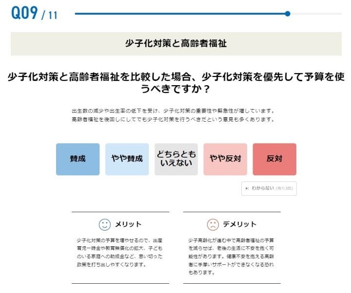投票マッチングがスマホやパソコンからいつでも、だれでも、どこからでも無料で利用することができます。また、各設問ページには設問の解説文やメリット・デメリットを掲載し、あなたの選択をサポートしますので、まずは気軽に触ってみてください。