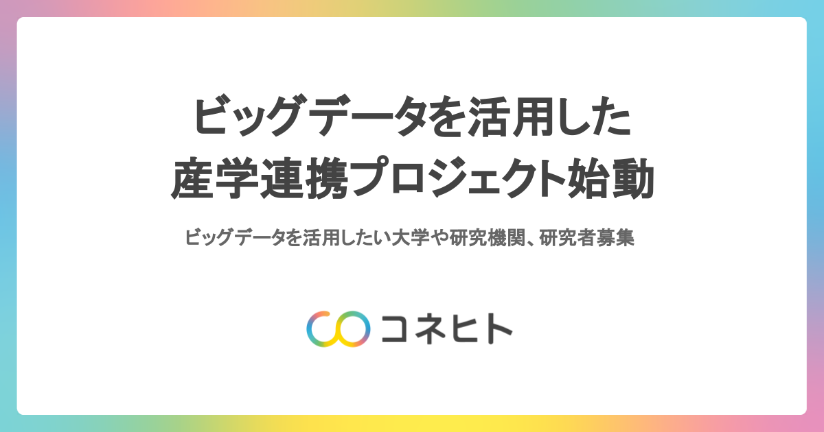いつどんな商品の購入を検討するのか、購買障壁はなんなのかを統計情報と生の声を使って明らかにし、生活者の悩みを商品開発や売り場開発に反映し、ビジネスグロースと子育て家庭の購買シーンの変化を促進しています。これらコネヒトデータの活用実績を踏まえ、この度、産学連携プロジェクトを始動し、ビッグデータを活用して研究いただく研究者の方の募集に至りました。