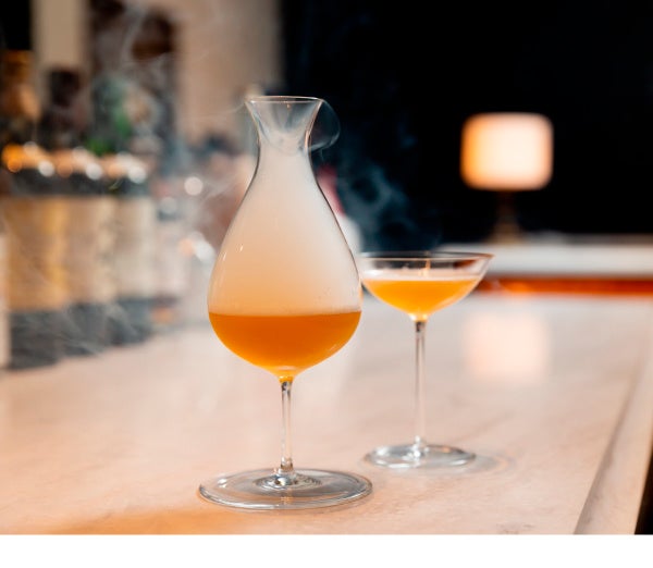 仕上げに⽬の前で燻製し真っ⽩な煙に包まれながら、視覚的にも楽しんでいただけるカクテルです。1階ホテルロビーのアートを鑑賞しながら、ぜひこちらのカクテルもお楽しみください。