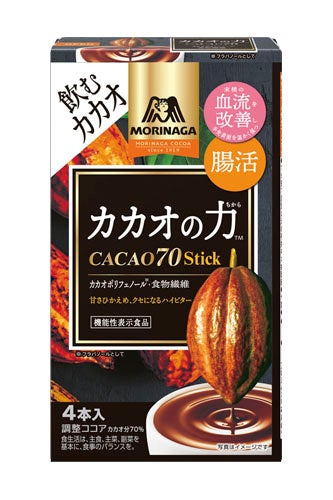 「カカオの力<CACAO70>」は、「血流改善(末梢の血流を改善し手先表面を温かく保つ)」と「腸活(カカオリグニンが、便通が気になる方のおなかの調子を整える)」のダブルヘルスクレームの『機能性表示食品』としてリニューアルして、2022年8月23日(火)より発売中です。