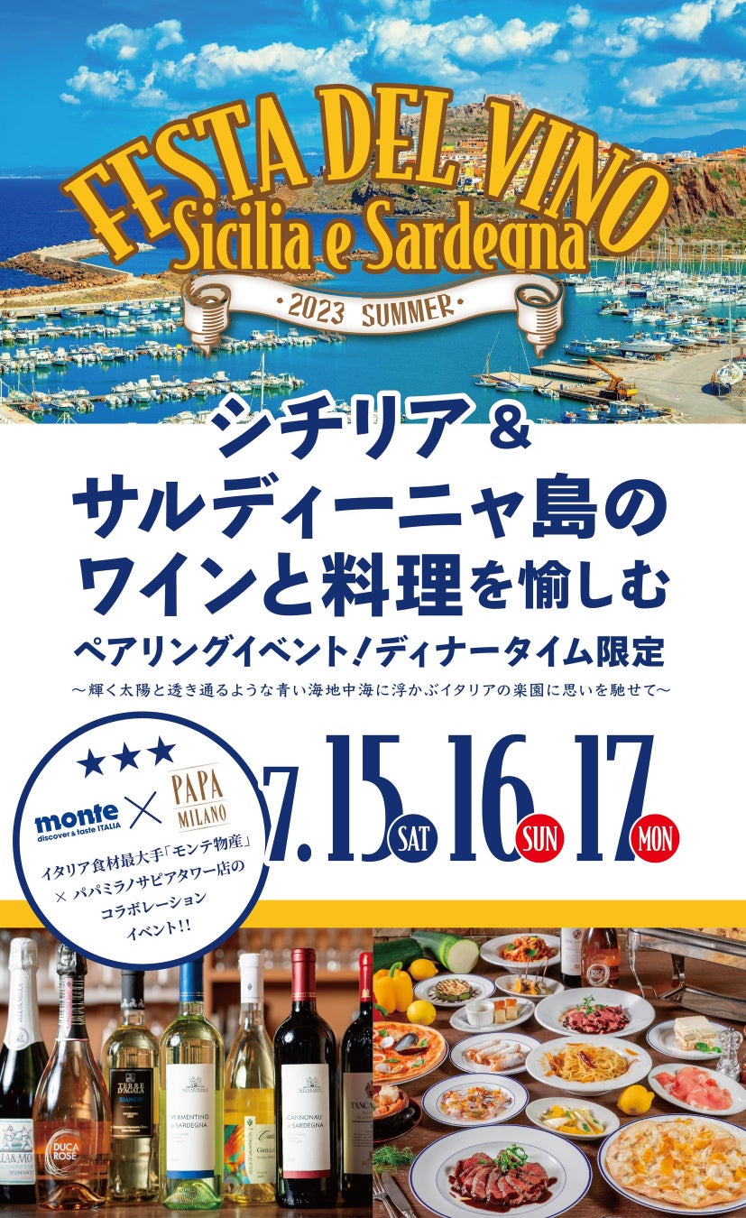 フェスタ デ ヴィーノ!シチリア州&サルディーニャ州のワインと料理を愉しむ!『銀座ワイン食堂 パパミラノ サピアタワー店』と『モンテ物産株式会社』のコラボイベントを期間限定開催