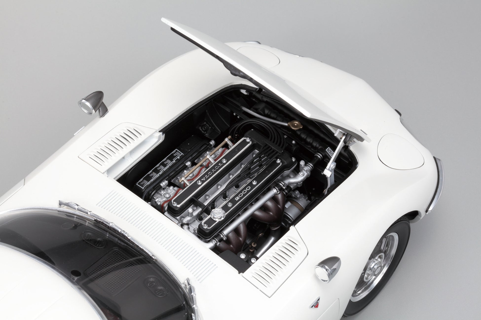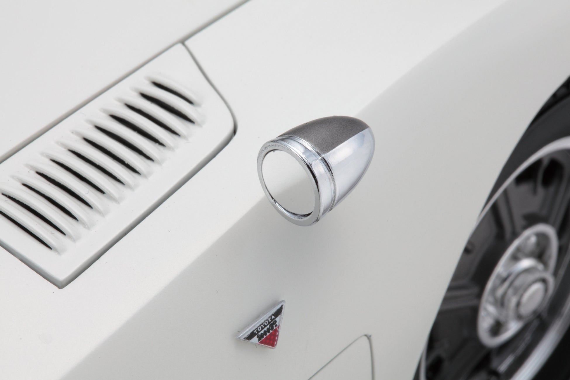 空気抵抗を極限まで減らすために生まれたロングノーズ、ファストバックの流麗なフォルム。リアで急激に立ち上がるシャープなエッジなど、見る者を魅了するTOYOTA 2000GT独特のスタイルを、一体成形のダイキャストで徹底追求しています。
