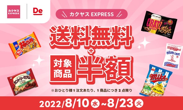 「カクヤスEXPRESS」全店で、期間中送料が無料。さらに対象の人気のスナック類が半額となります。