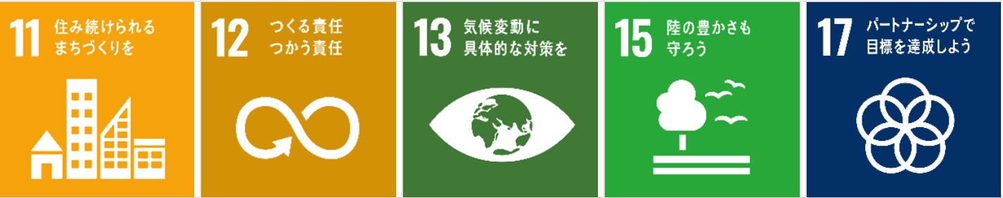 また当社は、本事業のサステナブルな商品づくりを通じて、SDGs番号11「住み続けられるまちづくりを」、SDGs番号12「つくる責任つかう責任」、SDGs番号13「気候変動に具体的な対策を」、SDGs番号15「陸の豊かさも守ろう」及びSDGs番号17「パートナーシップで目標を達成しよう」の実現にも努めてまいります。