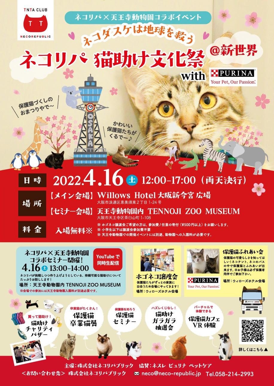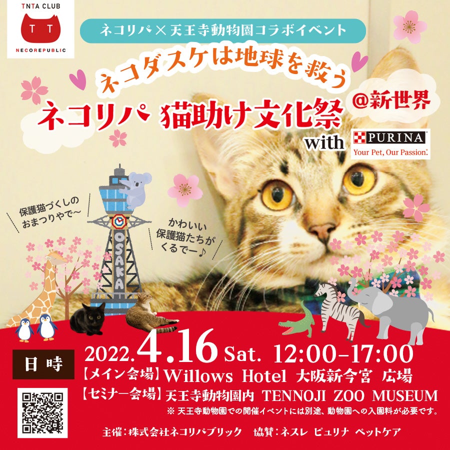 保護猫カフェ「ネコリパブリック」や保護猫のためのブランド「NECOREPA/」を運営する株式会社ネコリパブリック(本社所在地:東京都台東区、代表取締役:河瀬麻花)は4月16日(土)に大阪・新世界にて、ネコ好きによる、ネコのためのネコ祭りイベント「ネコリパ猫助け文化祭」を関西初開催いたします。
