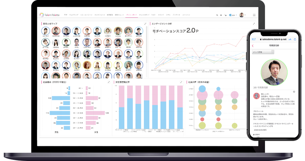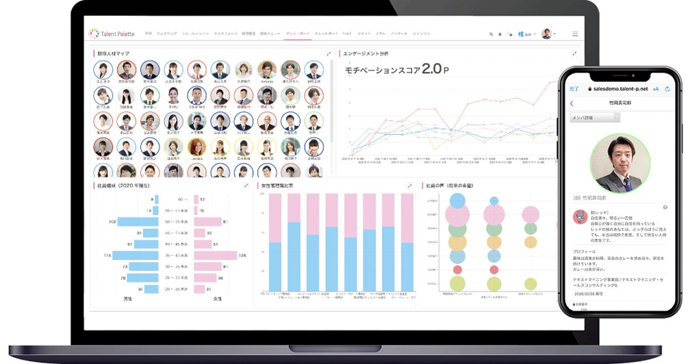 「タレントパレット(https://www.talent-palette.com/)」は、人材戦略に必須となる採用から育成、配置、評価、抜擢・活躍までを一気通貫で行い、人材情報を活用した科学的人事戦略を実現するタレントマネジメントシステムです。当社はこれまで3,000社超のビッグデータ活用支援を行ってきた実績があり、そこで磨き上げたデータ活用技術のノウハウを活かしています。タレントパレットの導入法人数は約2,700社を超え(契約社数1,200社、23年3月末時点)従来は管理するのみに留まっていた人材情報を分析し、そのデータを網羅的に活用することで経営層の意思決定を後押しします。具体的には人事情報、経歴、スキル、マインド(適性)、社員の希望や想い、日々のモチベーションやエンゲージメント、ヘルスケア(健康)までのデータを集約・活用することができます。これらのデータを分析することにより異動シミュレーションや研修まで含めた人材育成、テキストマイニングを活かした離職予兆の抽出、採用ミスマッチ防止、人的資本KPIのモニタリングなど、あらゆる人事戦略においてデータを活用した科学的人事戦略を実現します。
