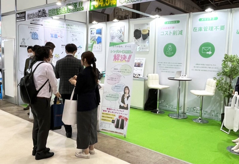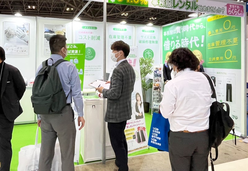 弊社ブースではレンタル事務服サービスのご紹介、使用済みユニフォームの回収・再資源化プロジェクトなど、働く人の「衣」に関するサービス紹介を行いました。