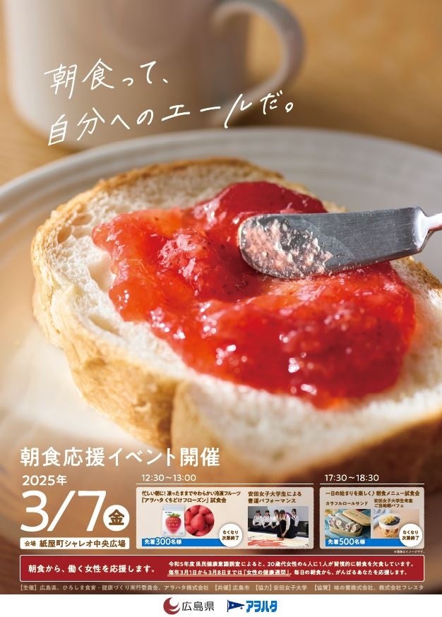 アヲハタ株式会社(本社:広島県竹原市、代表取締役社長:上田敏哉、以下アヲハタ)は、広島県の食育・健康づくりに関する普及啓発活動を推進するひろしま食育・健康づくり実行委員会とともに、2025年3月7日(金)(第一部:12:30~13:00、第二部17:30~18:30)に、広島市シャレオ中央広場にて朝食応援イベントを開催します。当日は、安田女子大学学生による書道パフォーマンスや、学生考案「アヲハタ 55ジャム」を使った「ご当地朝パフェ」の試食会、簡単朝食レシピの紹介などを行います。このイベントは、健康的な生活習慣に向けて、朝食から応援する取り組みの一環です。