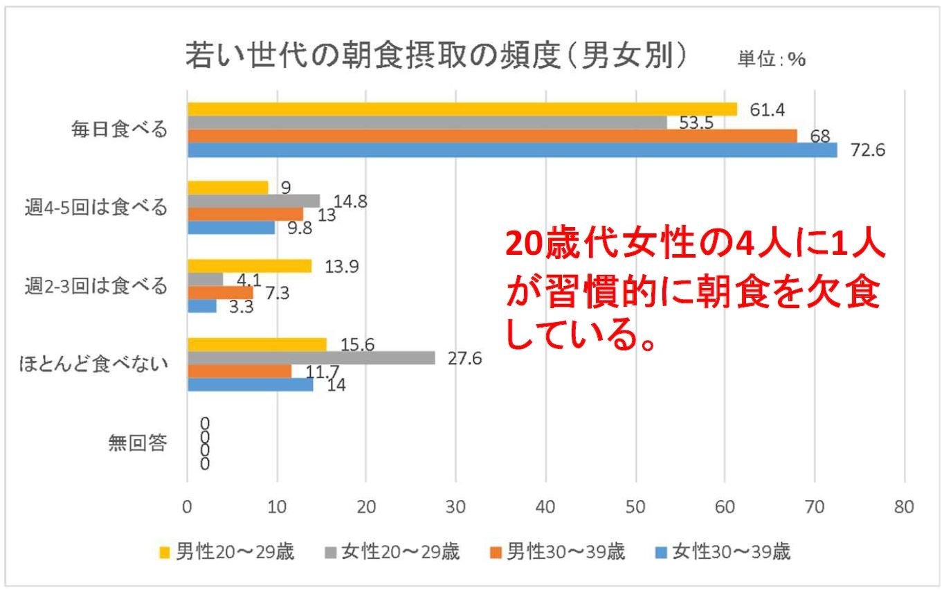近年の調査によると、広島県の20代女性の約4人に1人が習慣的に朝食を欠食していることが明らかになりました(図1)。将来的な健康へのリスクを鑑み、この状況を改善するため、アヲハタは、広島県、広島市、安田女子大学と共同し、毎日の朝食から応援するイベントを行います。