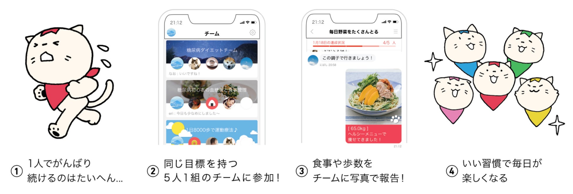 「みんチャレ」は、チームで歩く習慣を身につけられるアプリです。本事業への参加者が5人1組でチームを組み、チームメンバー同士で合計歩数目標を定めて、互いにチャット画面で励まし合いながら毎日チャレンジします。外出時に見つけた綺麗なお花や、その日の食事などの写真を毎日共有することでコミュニケーションが活性化するのと同時に、仲間との切磋琢磨によりモチベーションが高まり、運動習慣が身につきます。