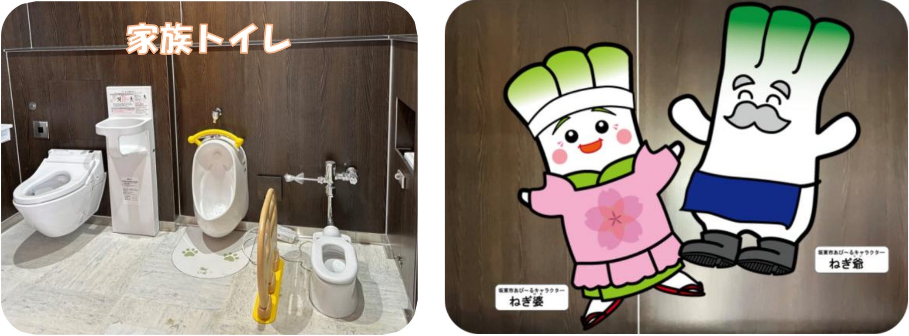 坂東市との連携により、坂東市のあぴ~るキャラクター「ねぎ爺」「ねぎ婆」を壁面に配置しました。