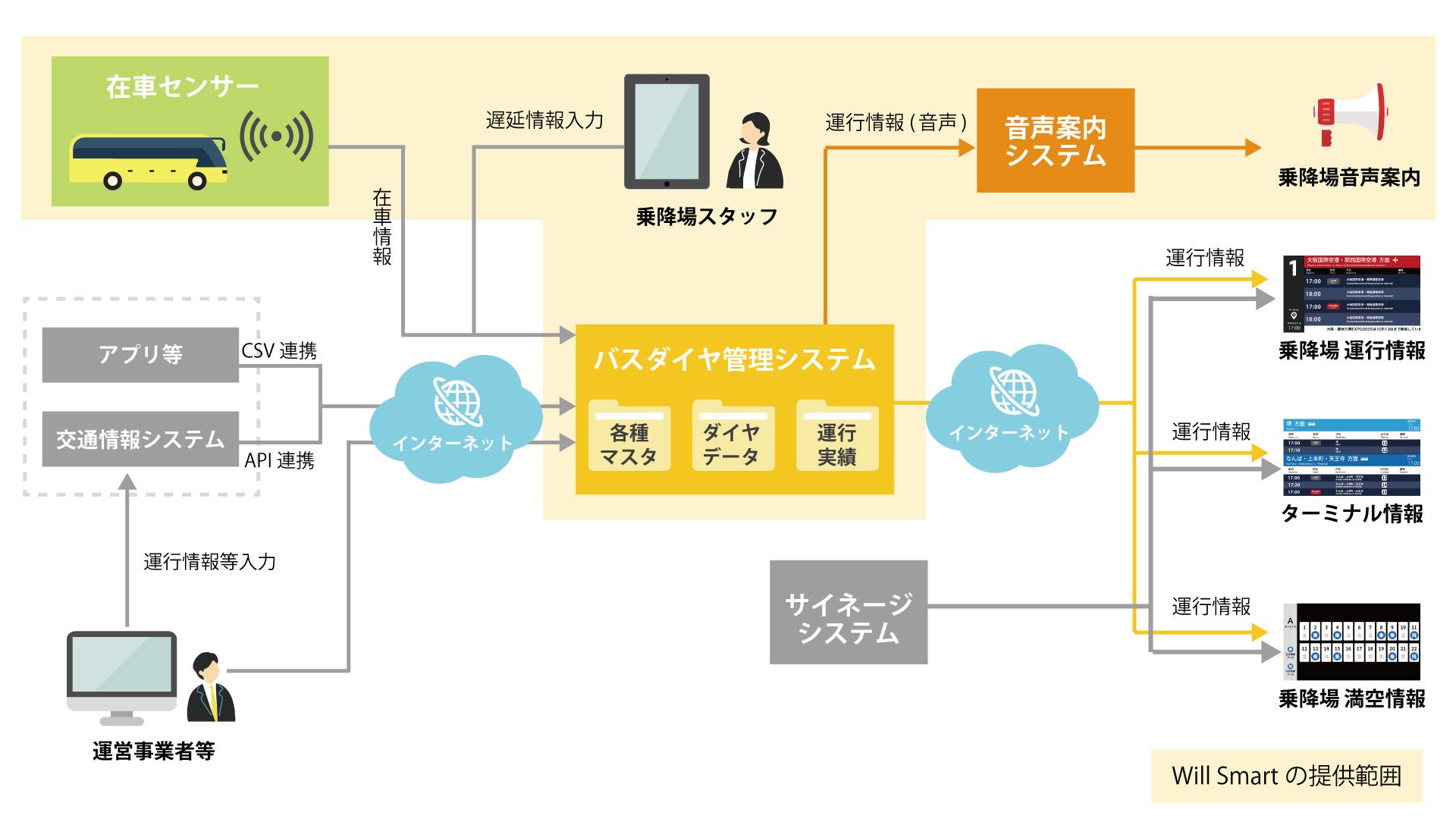 Will Smartのバスターミナル向け統合管理システムは、乗り場/ダイヤの登録および運行状況(変更、遅延、運休等)をクラウドシステムで管理し、運行情報を西エントランス広場入口とバス乗降場のサイネージシステムと連携します。また、在車センサーと連携することで各乗り場の満空情報を検知。乗降場スタッフが携行するタブレット端末での各発着場所の満空情報の確認及びタブレット端末を利用した遅延情報の入力や音声案内をリモートで操作できる仕組みを提供します。