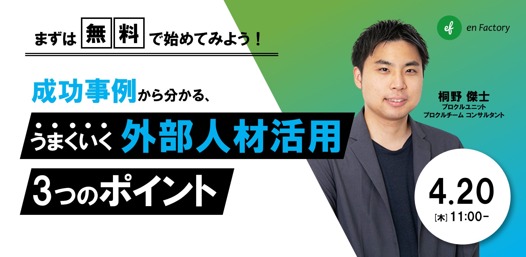 「無料で始める!成功事例から分かる外部人材活用の3つのポイント」ウェビナーを2023年4月20日(木)11:00から開催します。