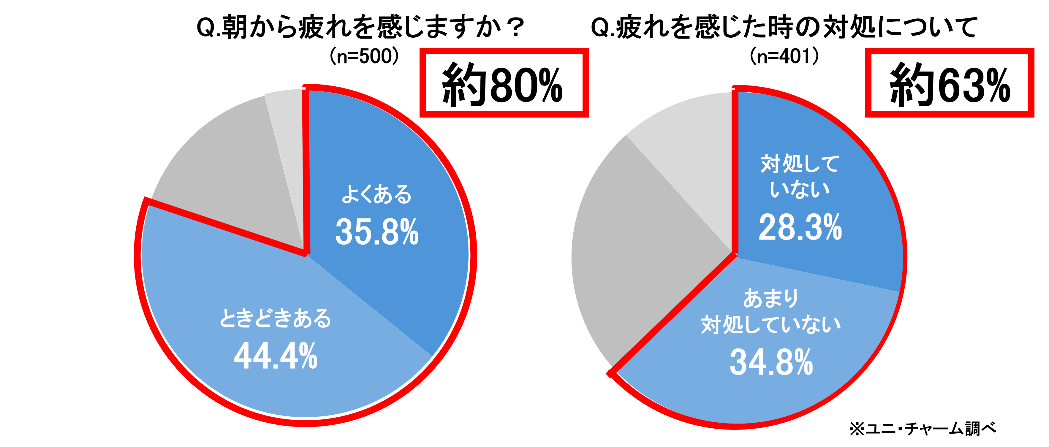 当社は、20~39歳の女性500名を対象に「女性の疲れに関する調査」を実施しました。その結果、約80%※の女性が朝から“なんとなく疲れている”と感じており、約63%※の女性が具体的な対処を行っていないことが明らかになりました。また、月経周期に伴うホルモンバランスの変化により、深部体温の上昇や血流量の低下が起こり、十分に睡眠をとっても疲れが取れにくい、日中に強い眠気を感じるなど、睡眠の質の低下を引き起こし、この状態が日常生活のパフォーマンスに影響することがわかりました。