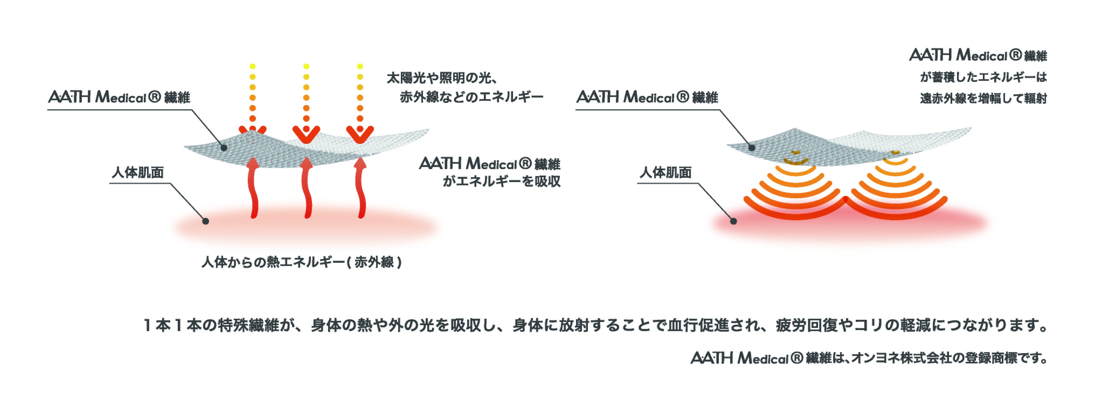 ・特殊繊維1本1本が、からだの熱や外の光を吸収し、からだに放射することで血行促進され、疲労回復やコリの軽減につながります