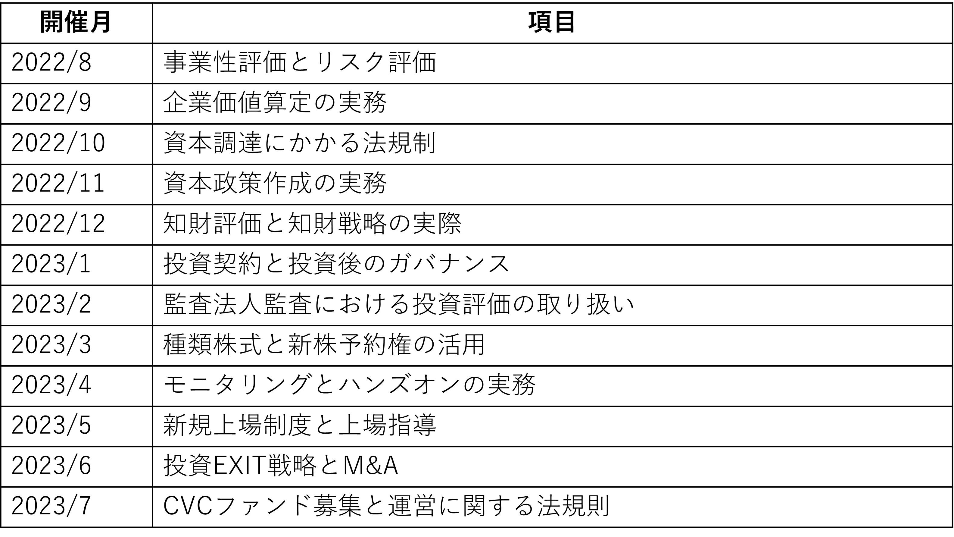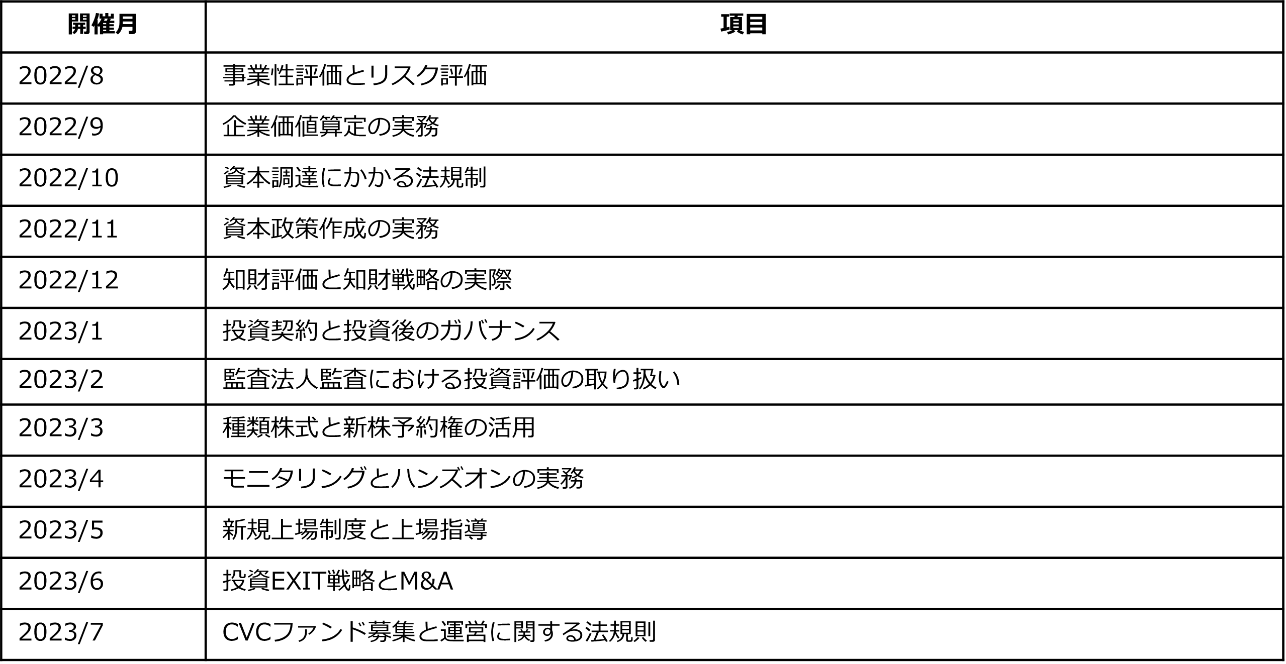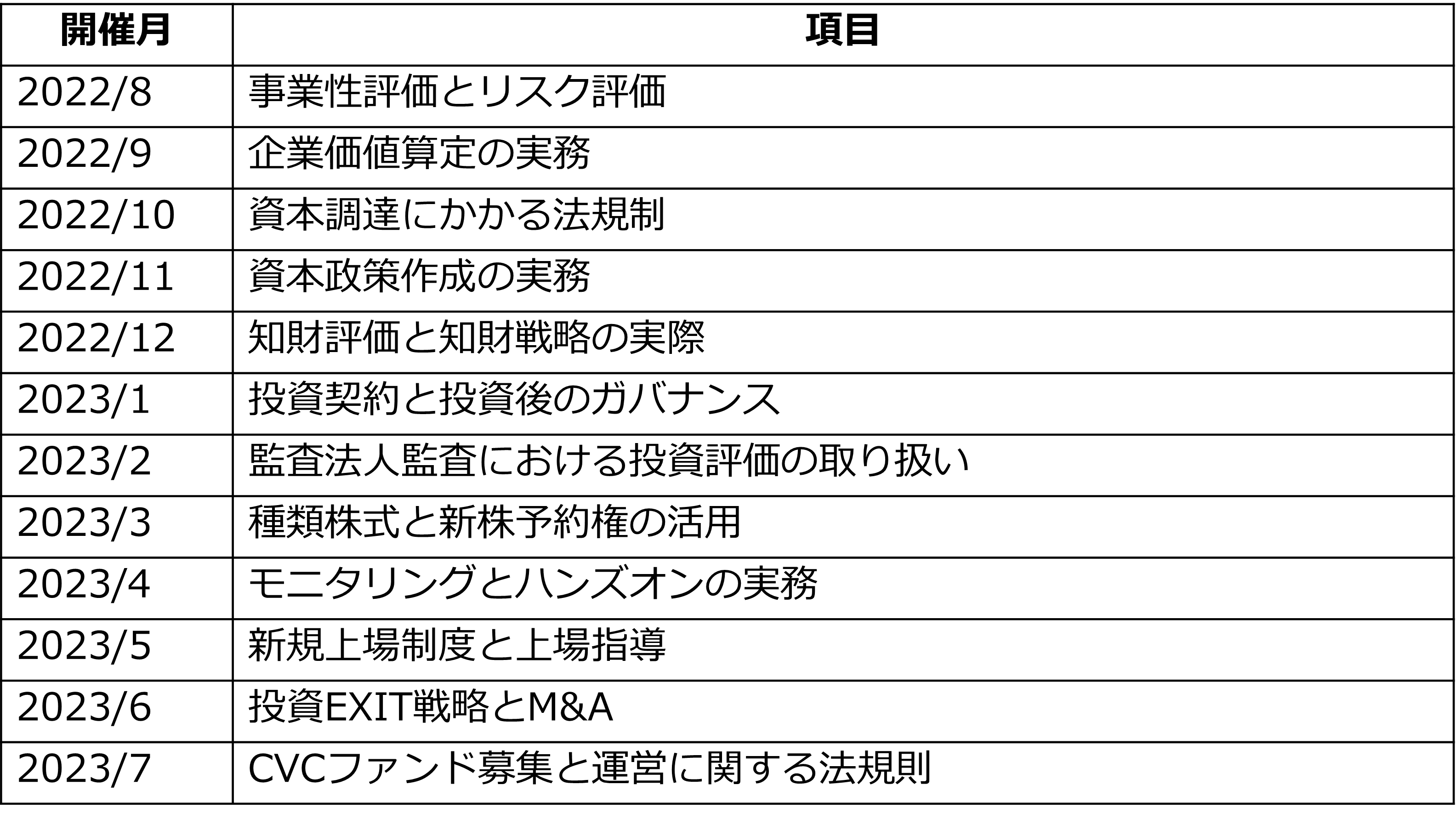 また、併せてサブスク会員に提供する「CVC担当者ナレッジ研修」は、上場会社等において他部門からCVC部門に異動してきた担当者を想定し、スタートアップ投資に必要なナレッジの提供とスキルの向上を目的としたものです。当社が従来e-learningとして提供してきた「ベンチャーキャピタリスト養成講座」及び、CVC向けの勉強会「いちもく勉強会」にて提供してきたカリキュラムを再構成してオンラインで提供します。上記CVC投資戦略研究会「スタートアップ・ソーシング代行サービス」及び「CVC担当者ナレッジ研修」は2022年8月1日より提供を開始しますが、提供開始に先立ち、以下の日程で説明会をオンライン開催します。