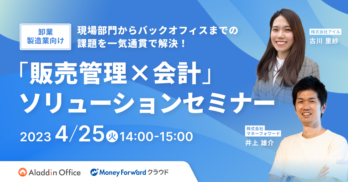 また2023年4月25日(火)にマネーフォワードと、「アラジンオフィス」と「マネーフォワード クラウド会計Plus」の機能や連携性について解説する、「現場部門からバックオフィスまでの課題を一気通貫で解決!『販売管理×会計』ソリューションセミナー」をオンラインで無料開催します。