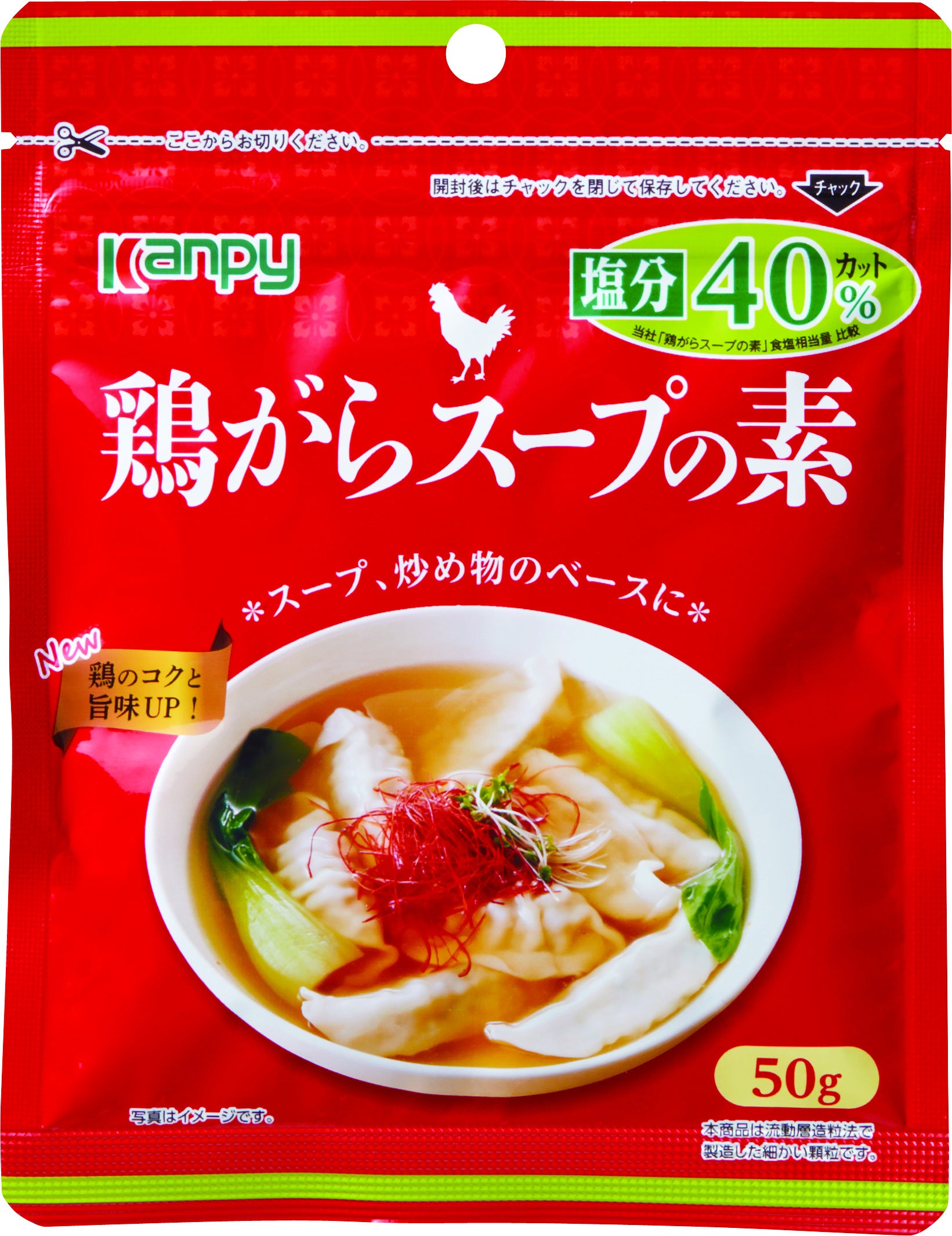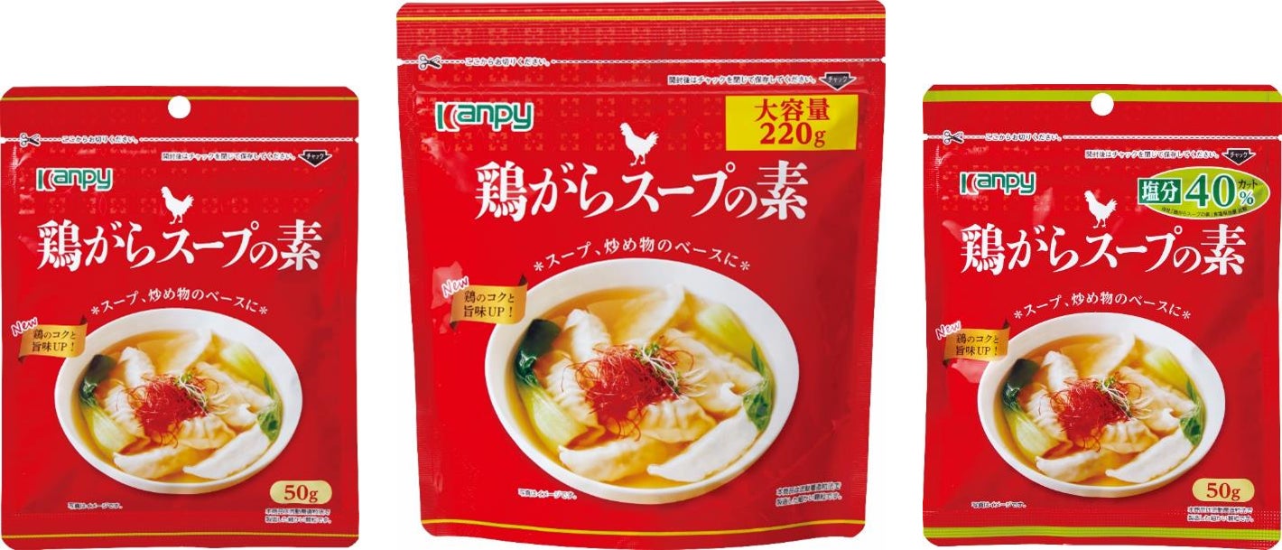 好評発売中の “鶏がらスープの素” をリニューアル!「カンピー 鶏がらスープの素(50g、220g、塩分40%カット50g)」