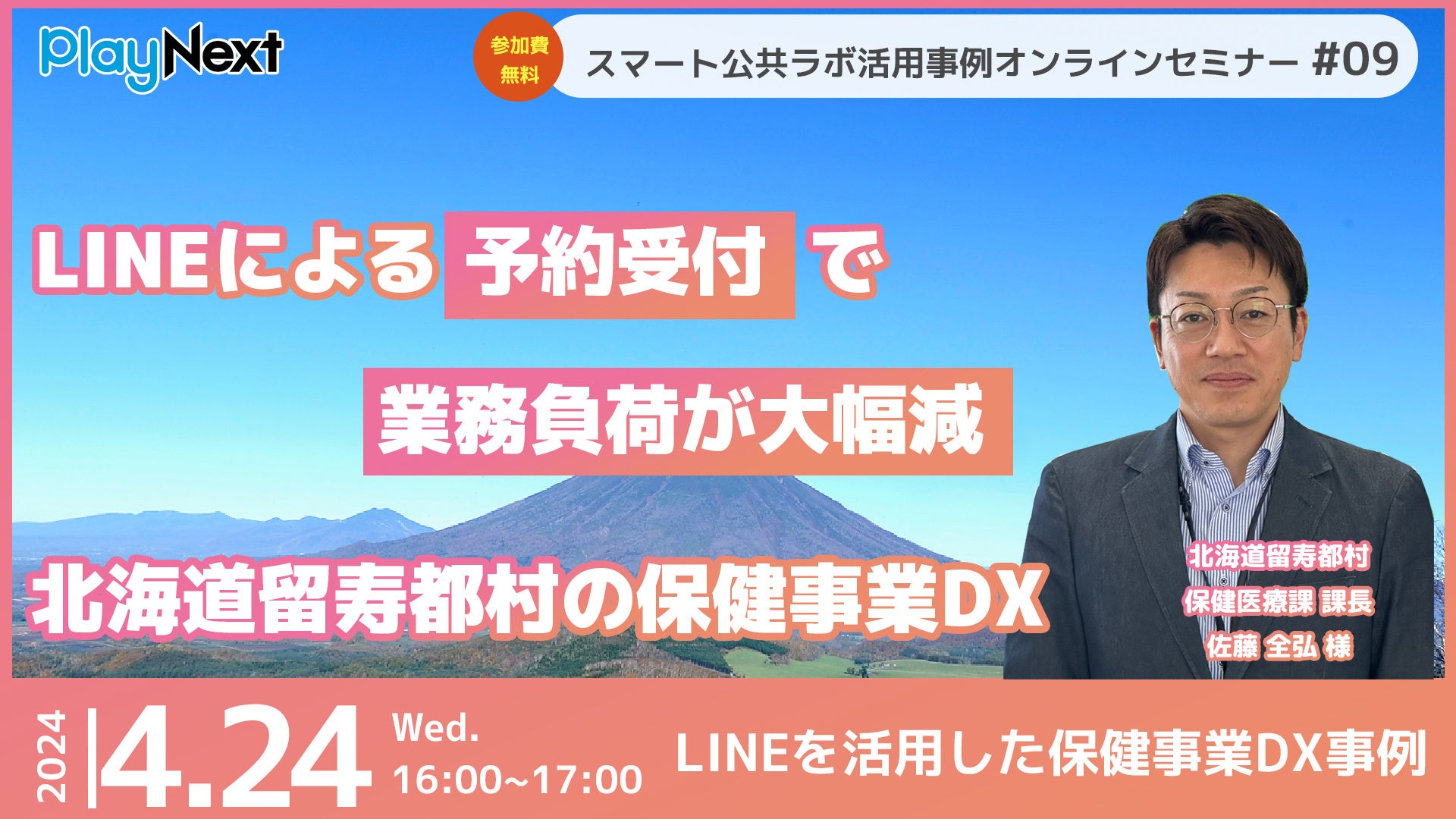 第9回スマート公共ラボ活用事例セミナー「LINEによる保健事業の予約受付で業務負荷が大幅減 〜留寿都村の事例〜」をテーマに4月24日無料開催!