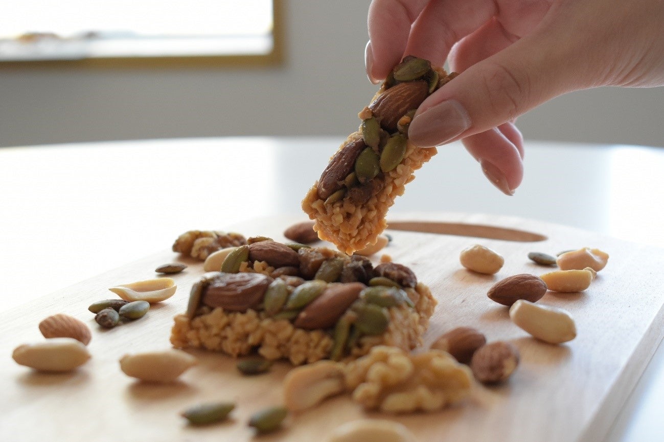 通常、ナッツやグラノーラなどを固めるには、砂糖・水あめ・小麦粉・バター・チョコレート(ココアバター)を用いますが、これらの代わりに独自の液体蒟蒻素材を使用することで、糖質や脂質などの余分な栄養や甘みを添加することなく、ナッツそのものの味と栄養を活かし、新しい食感のみを付与したスナックの開発に成功しました。