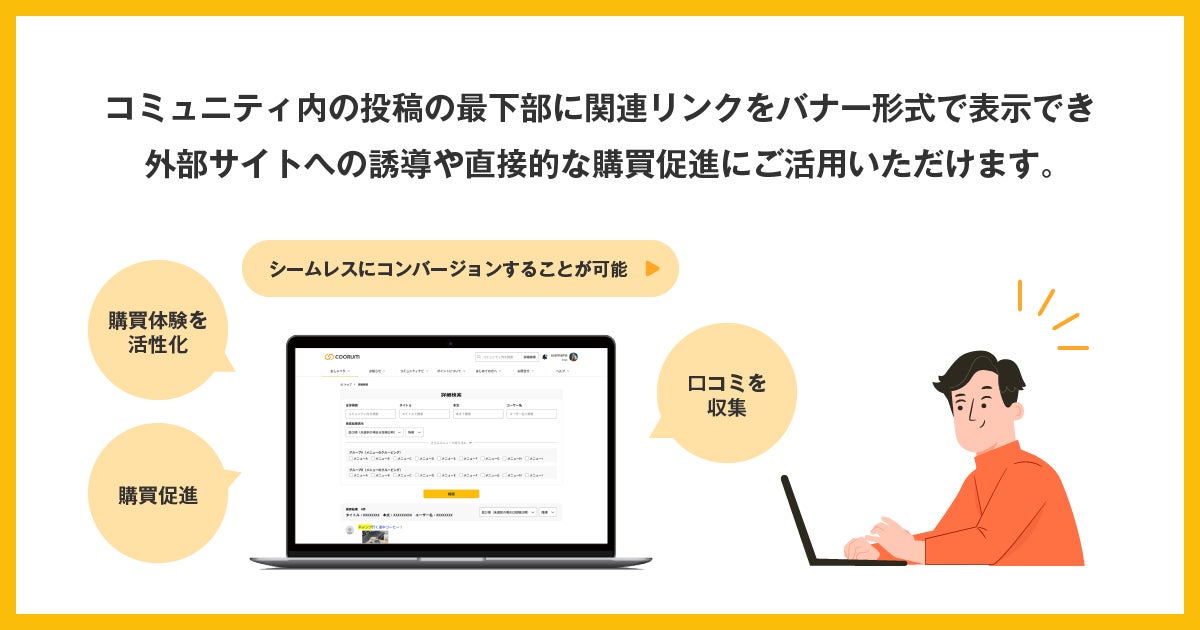 コミュニティ内の投稿に外部サイトのリンクが表示できるので、シームレスにCV(コンバージョン)に繋げることができます。